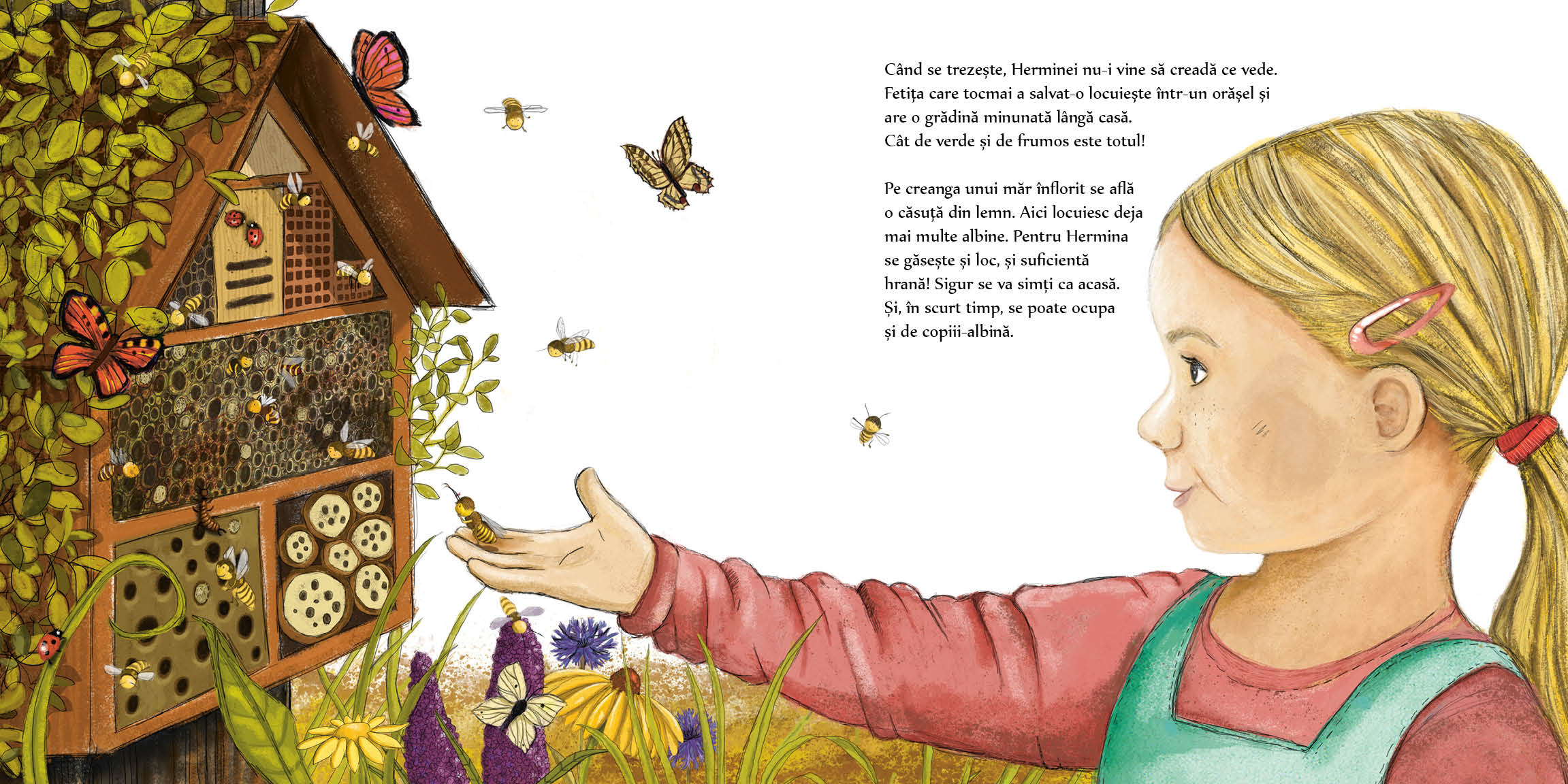 Cartea despre micuța albină Hermina este o carte cu imagini narative în care este povestită aventura micuței albinuțe. Înainte ca povestea să înceapă, micii cititori învață câte ceva despre familia de albine din care face parte Hermina – o specie de albine sălbatice. Pe o pagină față-verso există în mijloc un desen realist al unei albine din această specie, iar în jurul ei sunt secțiuni individuale de text cu informații utile și interesante. Aici, copiii învață multe despre caracteristicile fizice și comportamentul tipic al acestei specii de albine sălbatice.