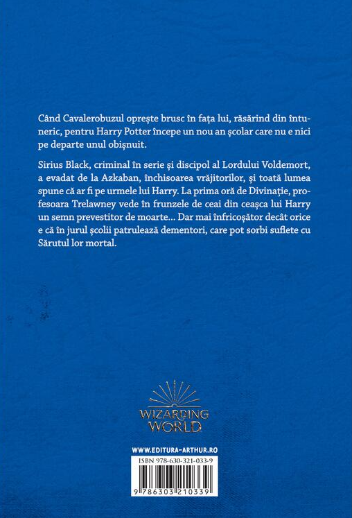 Sirius Black, criminal în serie şi discipol al Lordului Voldemort, a evadat de la Azkaban, închisoarea vrăjitorilor, şi toată lumea spune că ar fi pe urmele lui Harry. La prima oră de divinaţie, profesoara Trelawney vede în frunzele de ceai din ceaşca lui Harry un semn prevestitor de moarte... Dar mai înfricoşător decât orice e că în jurul şcolii patrulează dementori, care pot sorbi suflete cu Sărutul lor mortal.