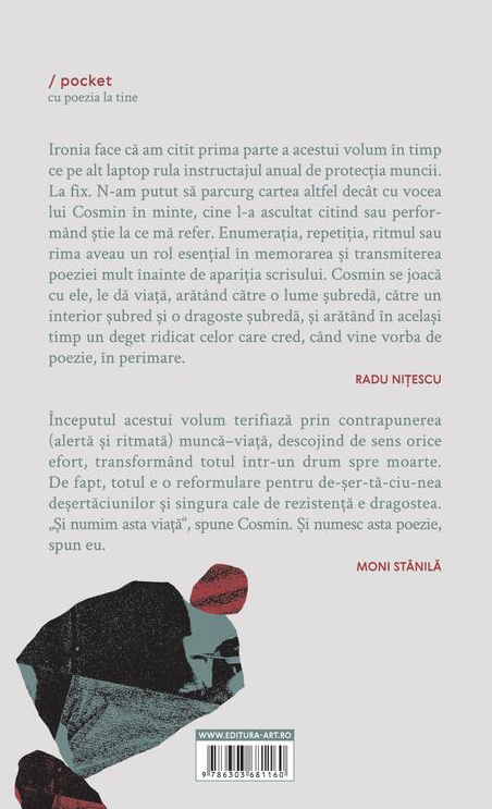 Începutul acestui volum terifiază prin contrapunerea (alertă și ritmată) muncă–viață, descojind de sens orice efort, transformând totul într-un drum spre moarte. De fapt, totul e o reformulare pentru de-șer-tă-ciu-nea deșertăciunilor și singura cale de rezistență e dragostea. „Și numim asta viață“, spune Cosmin. Și numesc asta poezie, spun eu.