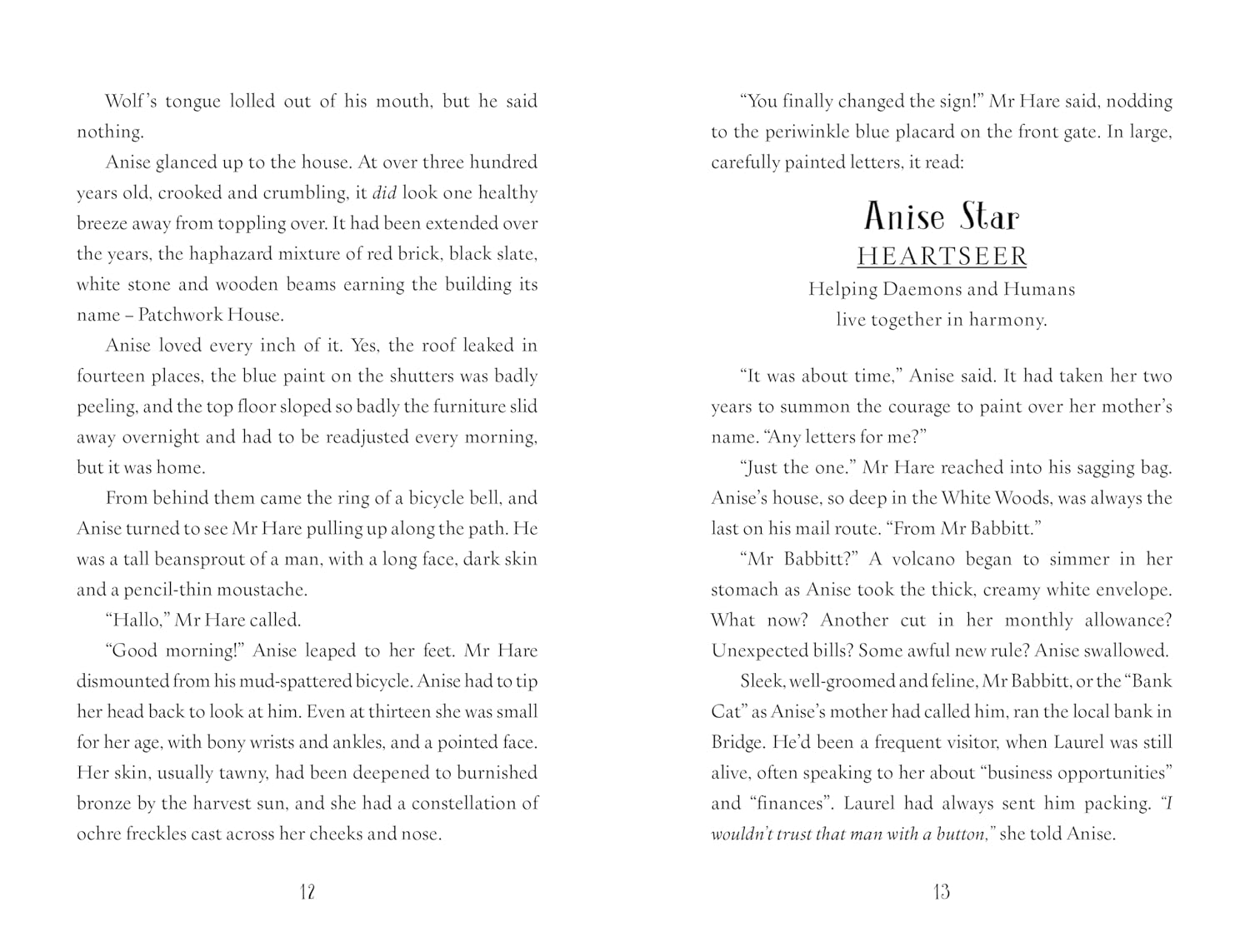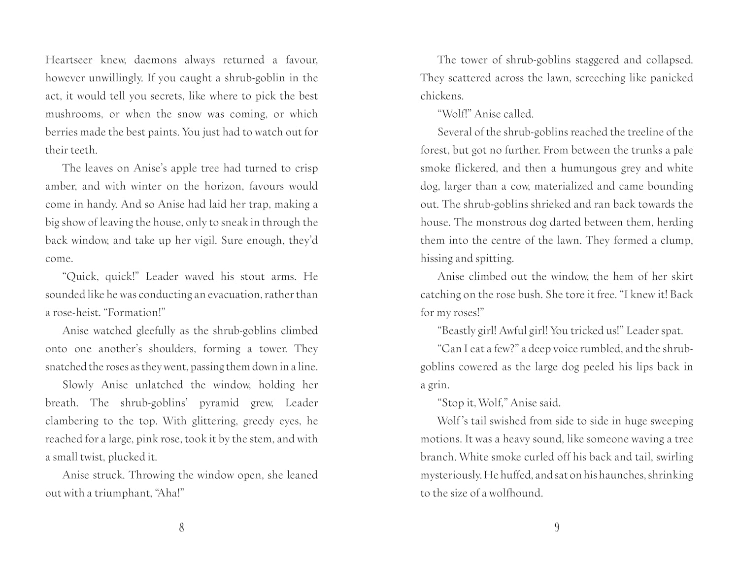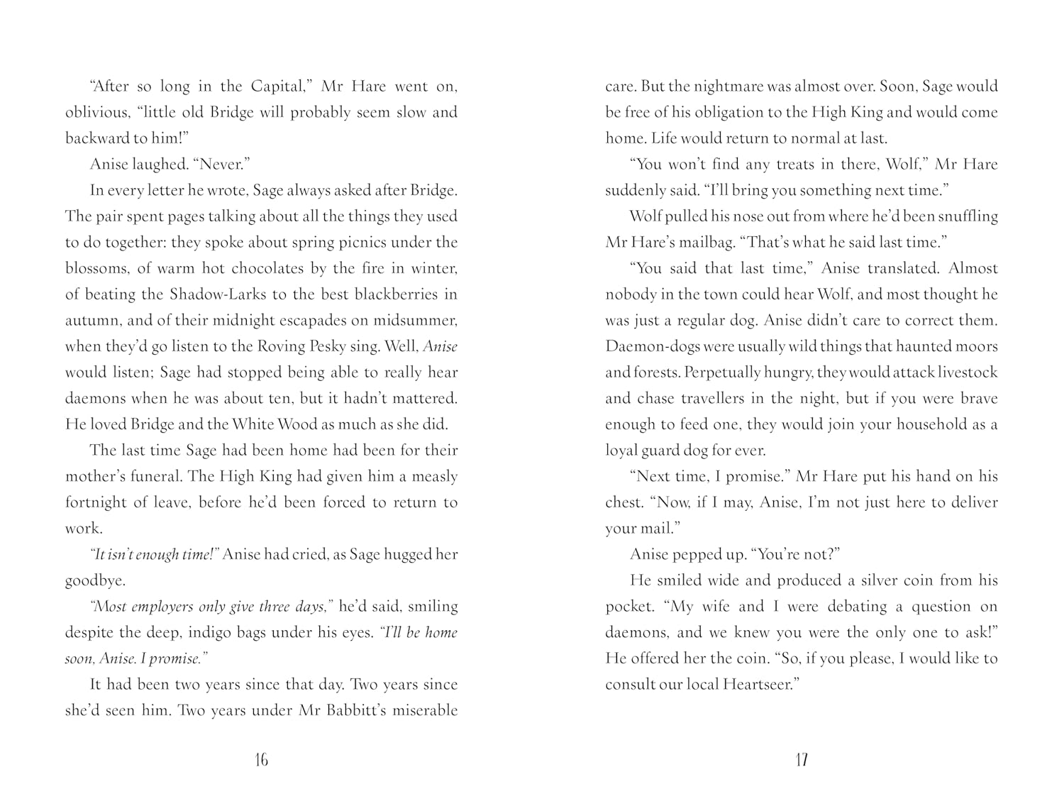 Anise's job is to help humans and daemons live happily together. But when the villainous Mr Babbitt tries to steal her home in the White Woods and drive the daemons out, she is forced to travel to the capital to ask the High King for help. First, though, she'll have to convince him that daemons still exist.