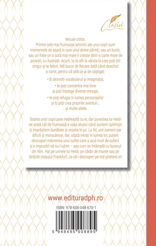 „Heidi” este o poveste despre inocență, prietenie, compasiune și frumusețea vieții simple. Este considerată una dintre cele mai iubite și mai influente cărți pentru copii din literatura mondială și a fost adaptată în diverse filme, seriale TV și piese de teatru de-a lungul anilor.