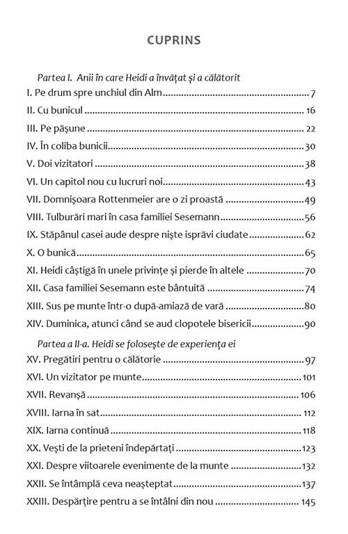 „Heidi” este un roman clasic pentru copii scris de Johanna Spyri, publicat în 1881. Povestea urmărește viața unei fetițe orfane, Heidi, care este trimisă să trăiască cu bunicul ei, în Alpii elvețieni. Heidi descoperă frumusețea naturii și bucuriile vieții simple de la munte.