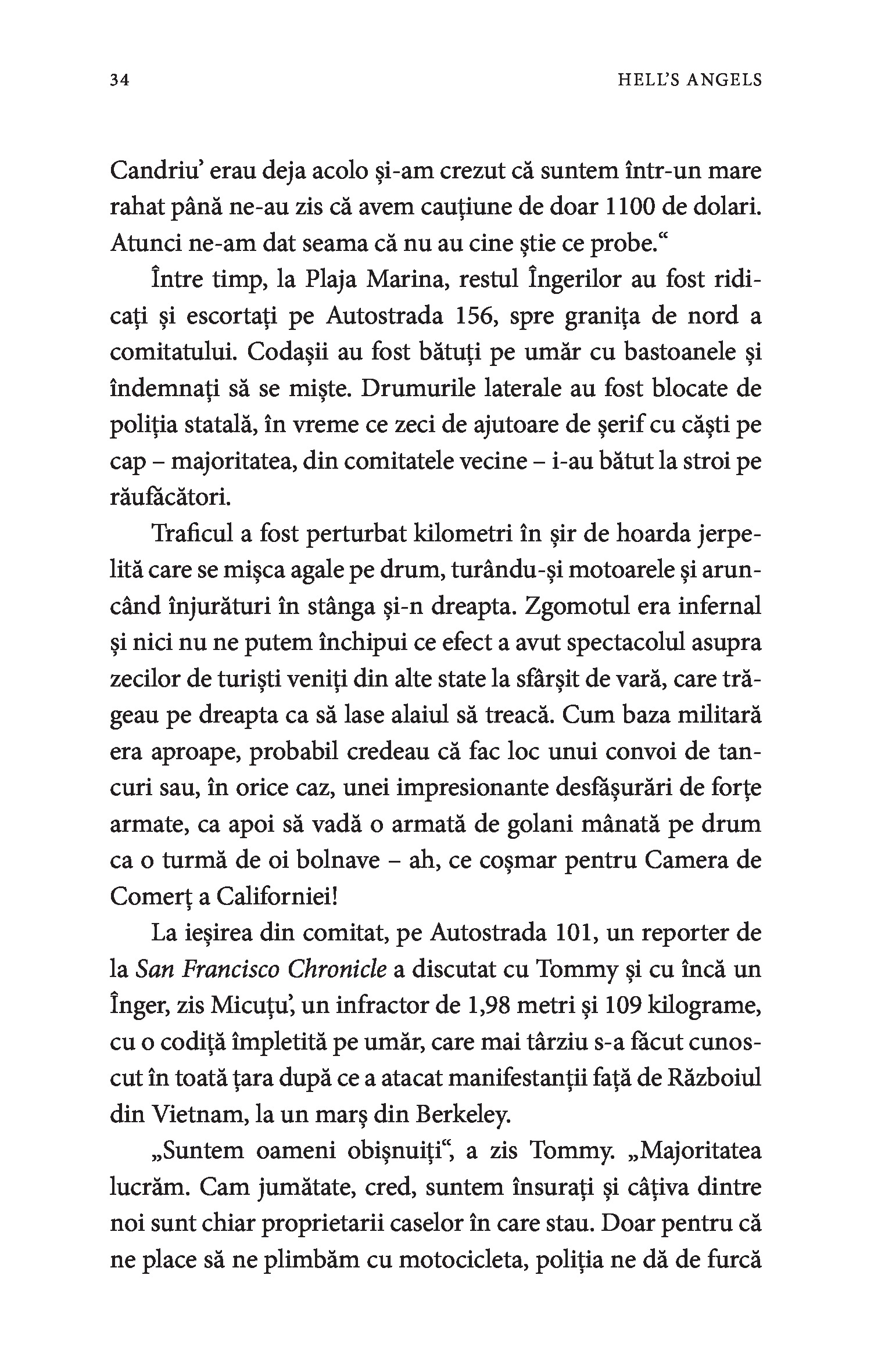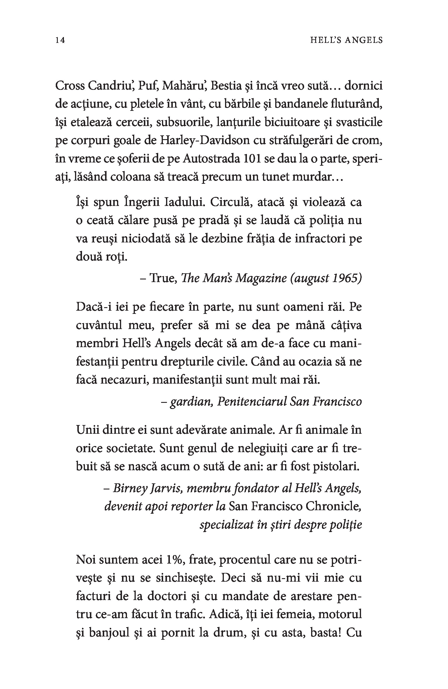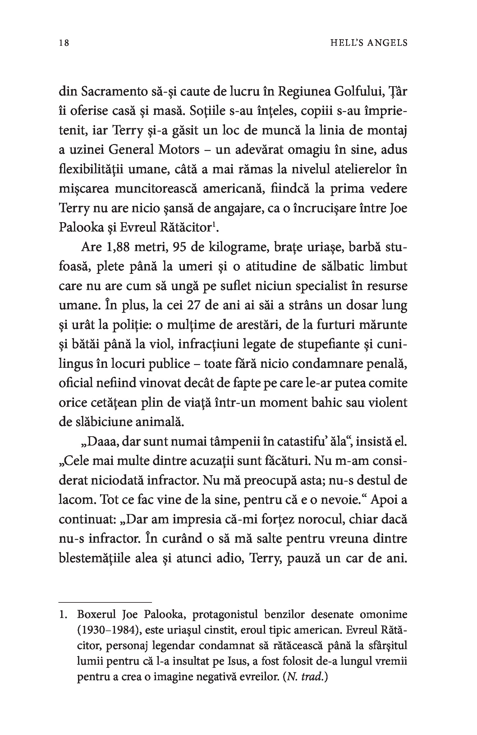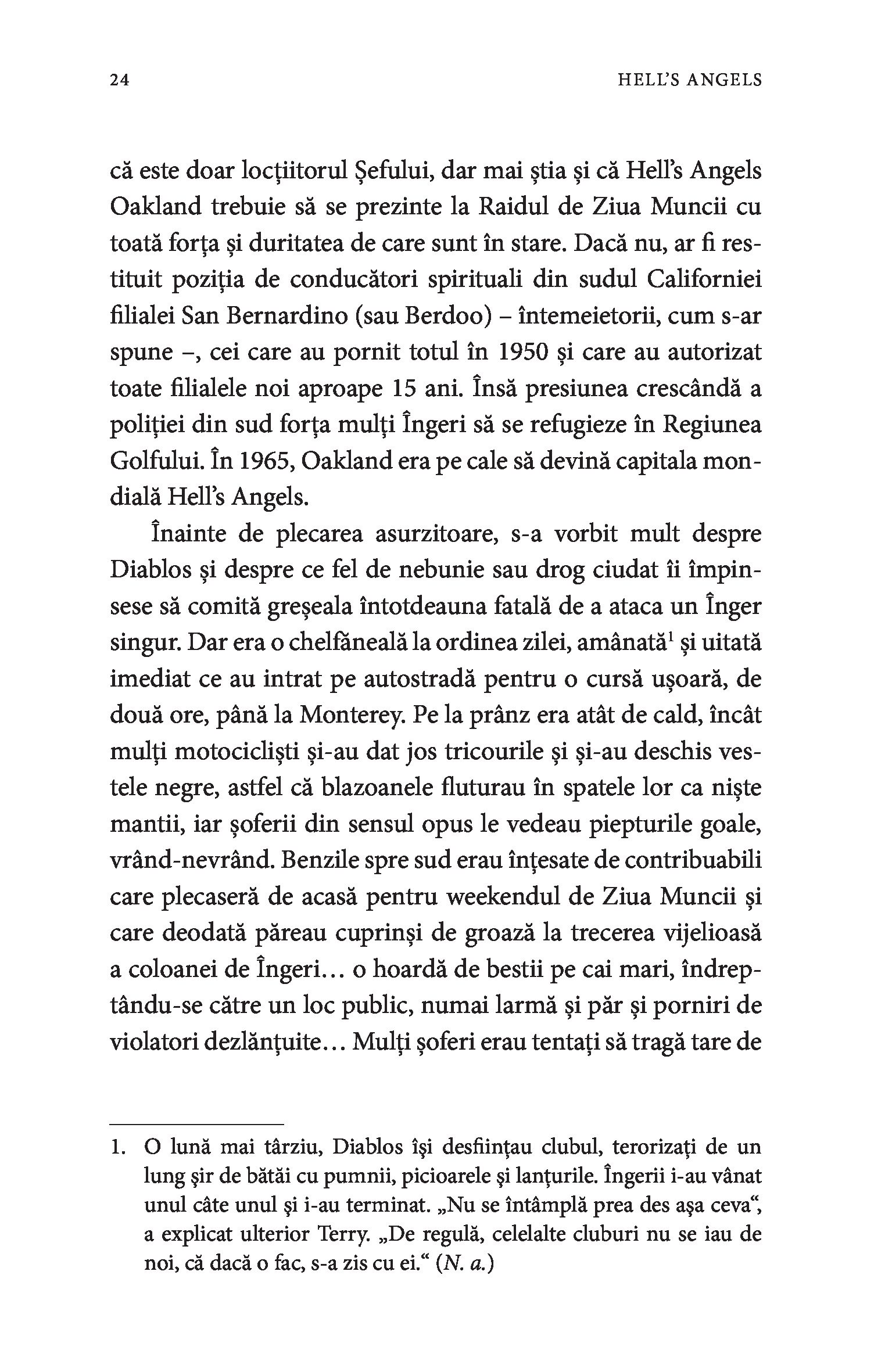 Hell’s Angels este și o carte despre Hunter S. Thompson, scriitorul care a stat peste un an în mijlocul Îngerilor, împreună cu care a călătorit, a participat la raiduri, a băut tone de bere și s-a drogat. Cu unii s-a împrietenit, alții l-au privit mereu cu neîncredere. Cu toate că nu s-a integrat niciodată complet în grupul lor, Thompson a ajuns să îi înțeleagă mai bine decât oricine pe acești nonconformiști.