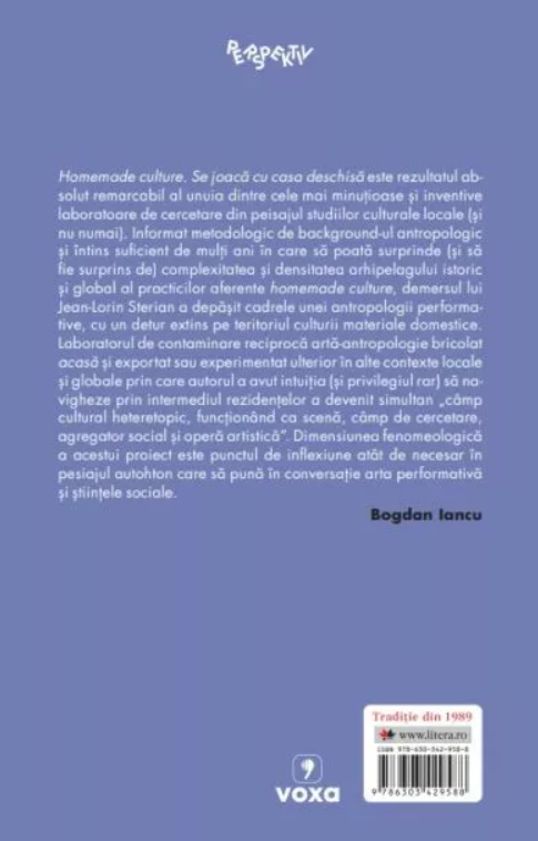 Homemade culture. Se joacă cu casa deschisă este rezultatul absolut remarcabil al unuia dintre cele mai minuțioase și inventive laboratoare de cercetare din peisajul studiilor culturale locale (și nu numai). Informat metodologic de background-ul antropologic și întins suficient de mulți ani în care să poată surprinde (și să fie surprins de) complexitatea și densitatea arhipelagului istoric și global al practicilor aferente homemade culture, demersul lui Jean-Lorin Sterian a depășit cadrele unei antropologii performative, cu un detur extins pe teritoriul culturii materiale domestice.