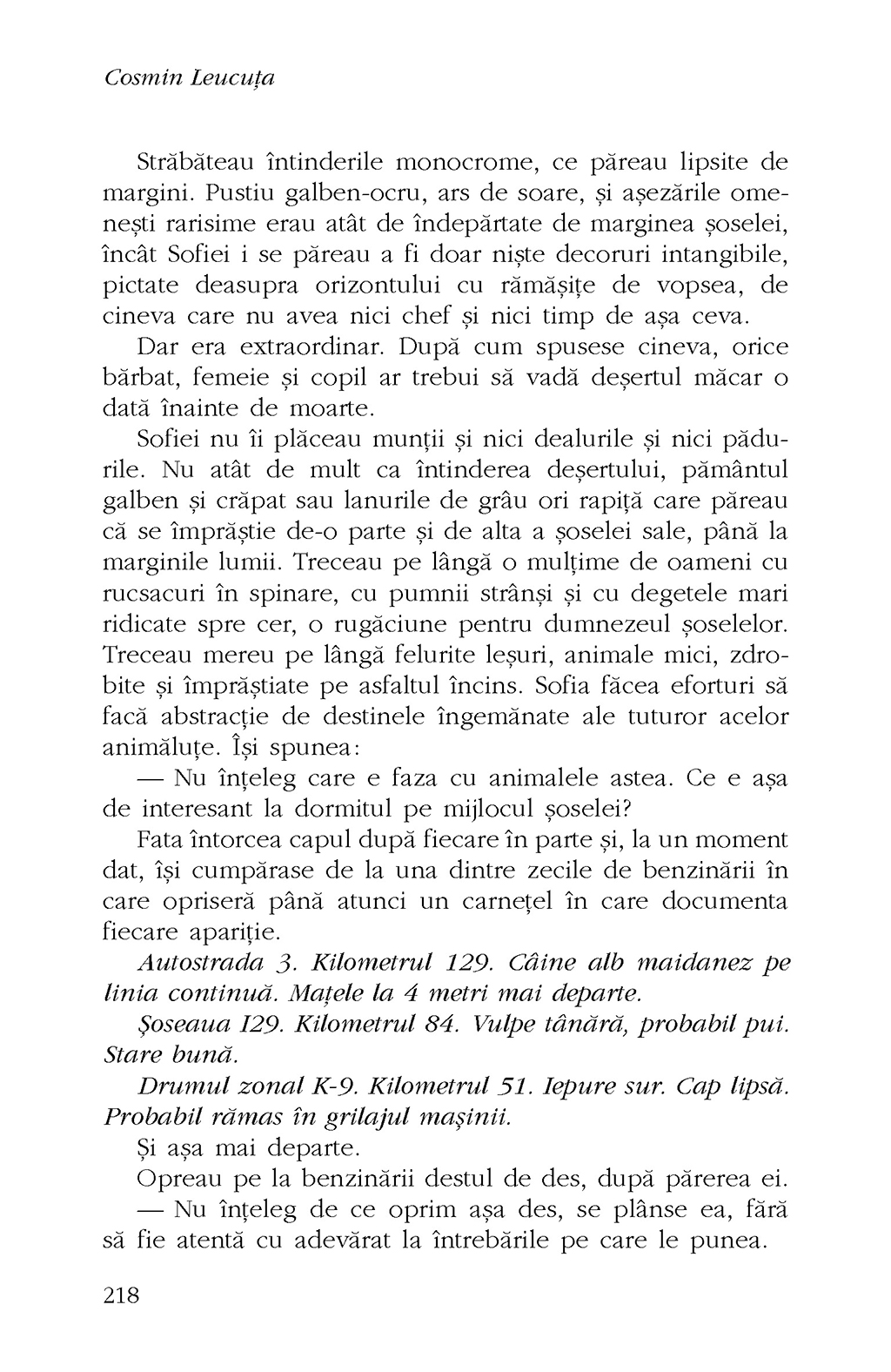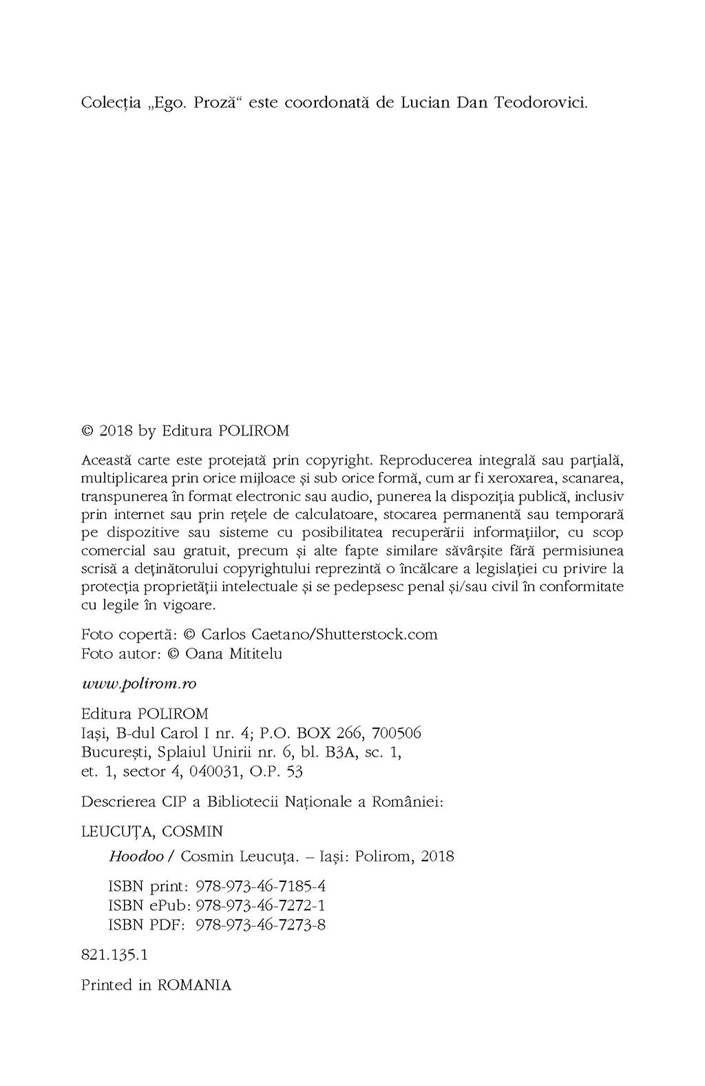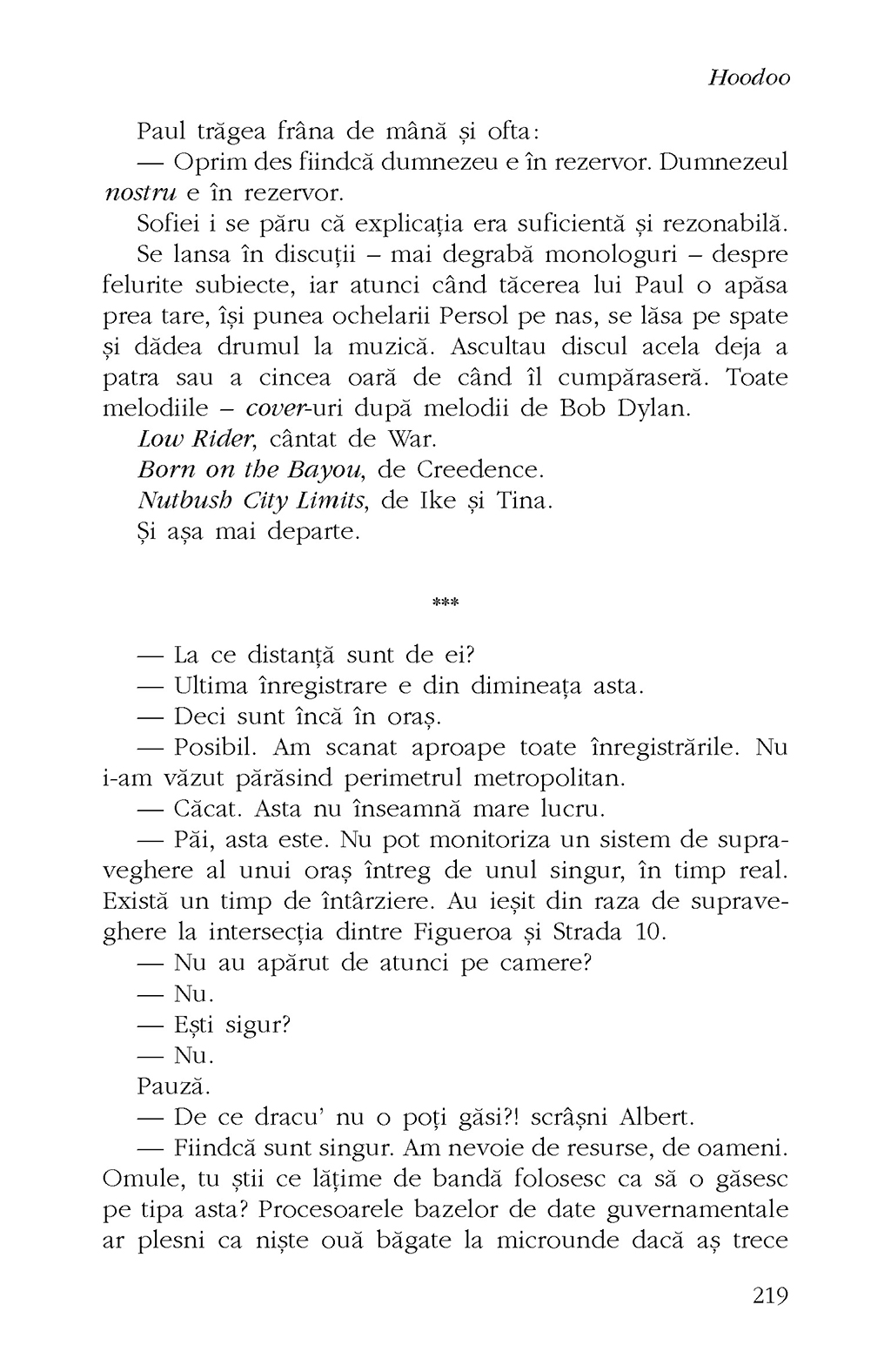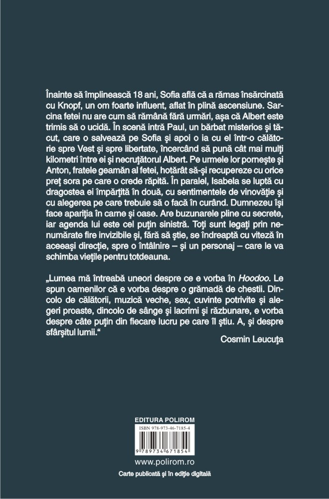 „Lumea mă întreabă uneori despre ce e vorba în Hoodoo. Le spun oamenilor că e vorba despre o grămadă de chestii. Dincolo de călătorii, muzică veche, sex, cuvinte potrivite şi alegeri proaste, dincolo de sînge şi lacrimi şi răzbunare, e vorba despre cîte puţin din fiecare lucru pe care îl ştiu. A, şi despre sfîrşitul lumii.” (Cosmin Leucuţa)