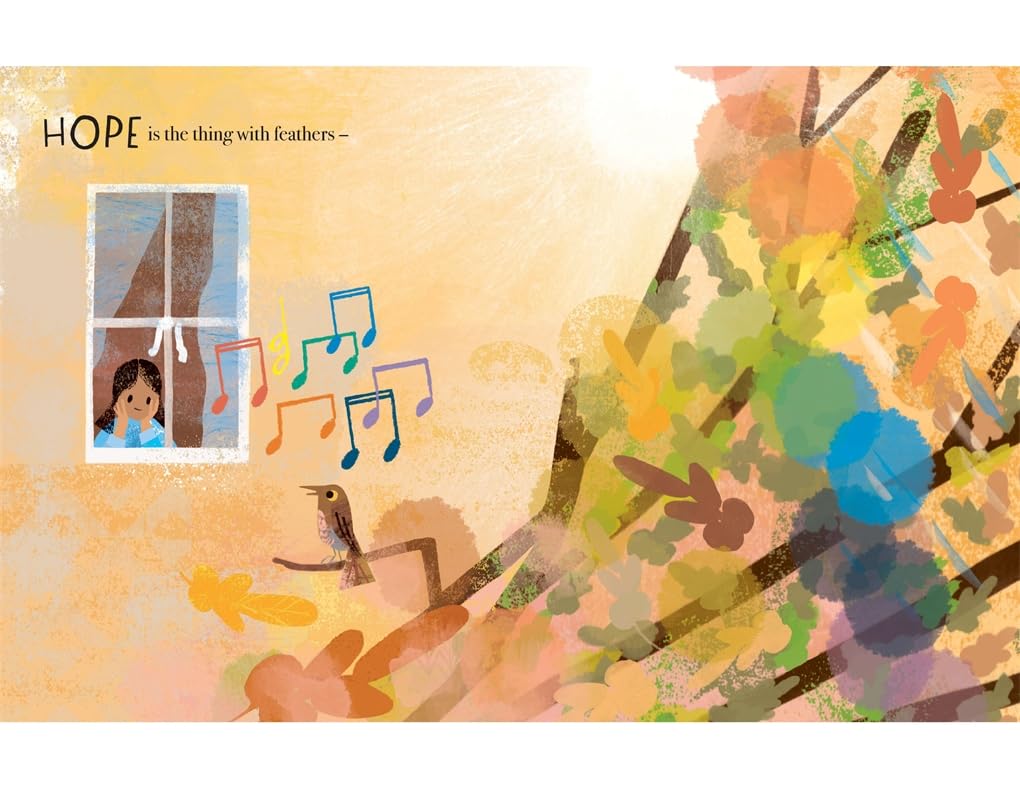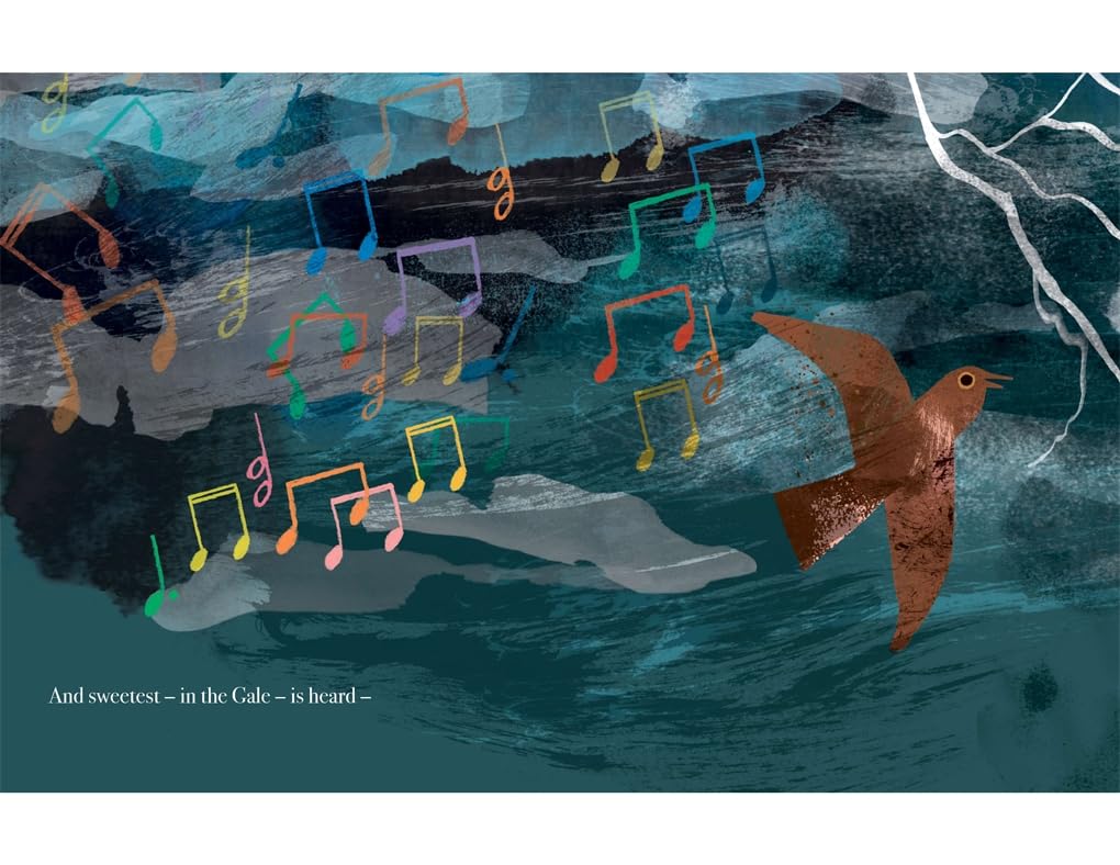 Follow one brave little bird as it flies around the world, giving hope to people everywhere through its beautiful tune. Even a terrible storm can't dampen this little bird - like hope, it continues unabashed, never asking anything from the people who take comfort from it. This stunning book, illustrated by best-selling artist Tim Hopgood, celebrates Emily Dickinson's original poem and makes it accessible for pre-schoolers.