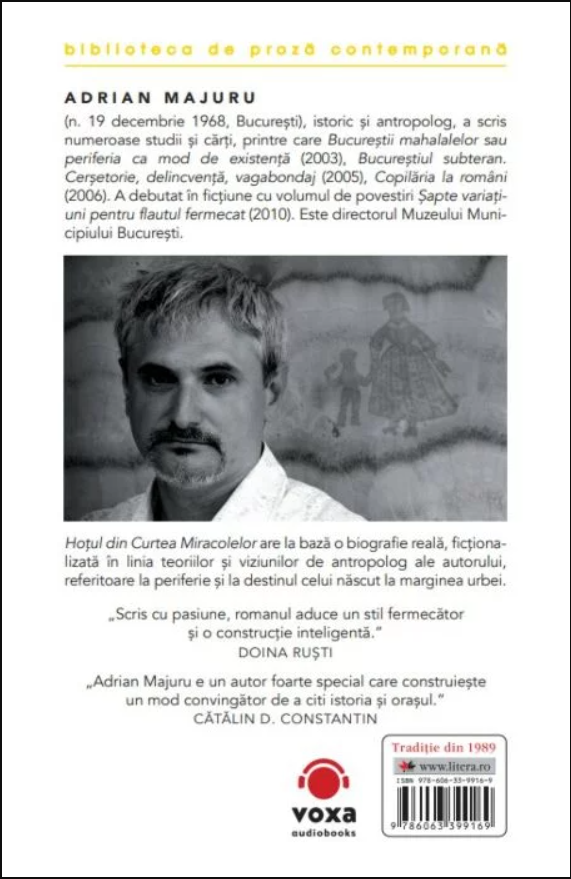 DRIAN MAJURU (n. 19 decembrie 1968, București), istoric și antropolog, a scris numeroase studii și cărți, printre care Bucureștii mahalalelor sau periferia ca mod de existență (2003), Bucureștiul subteran. Cerșetorie, delincvență, vagabondaj (2005), Copilăria la români (2006). A debutat în ficțiune cu volumul de povestiri Șapte variațiuni pentru flautul fermecat (2010). Este directorul Muzeului Municipiului București.