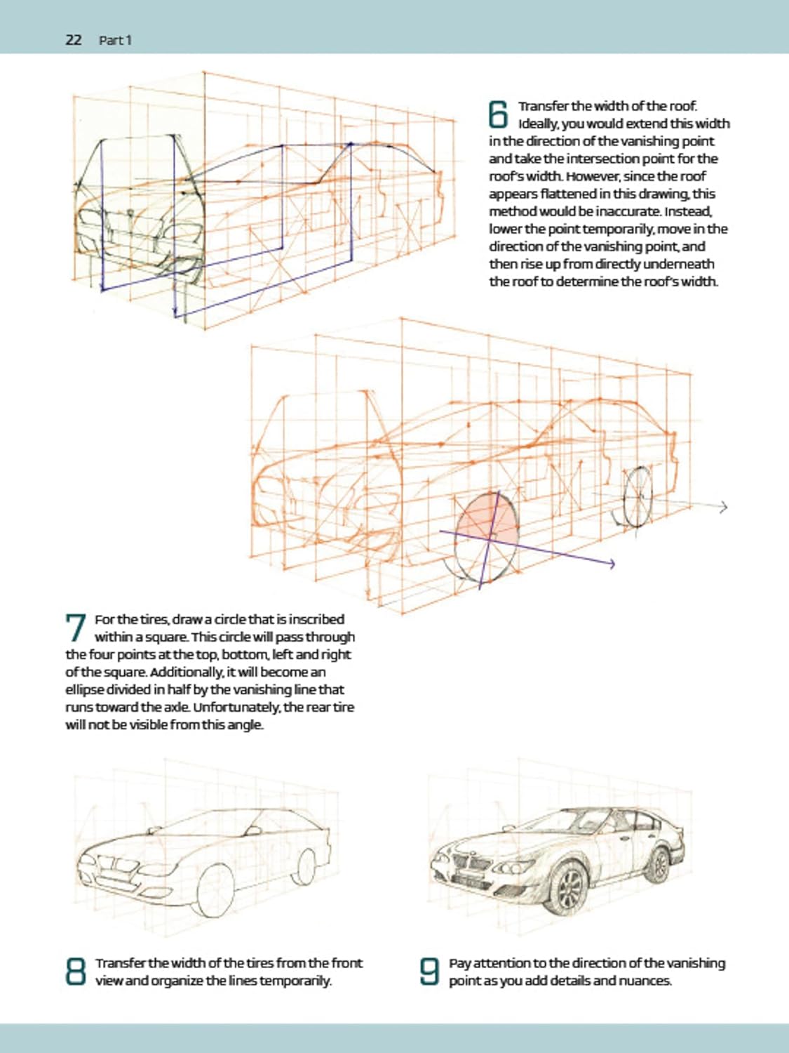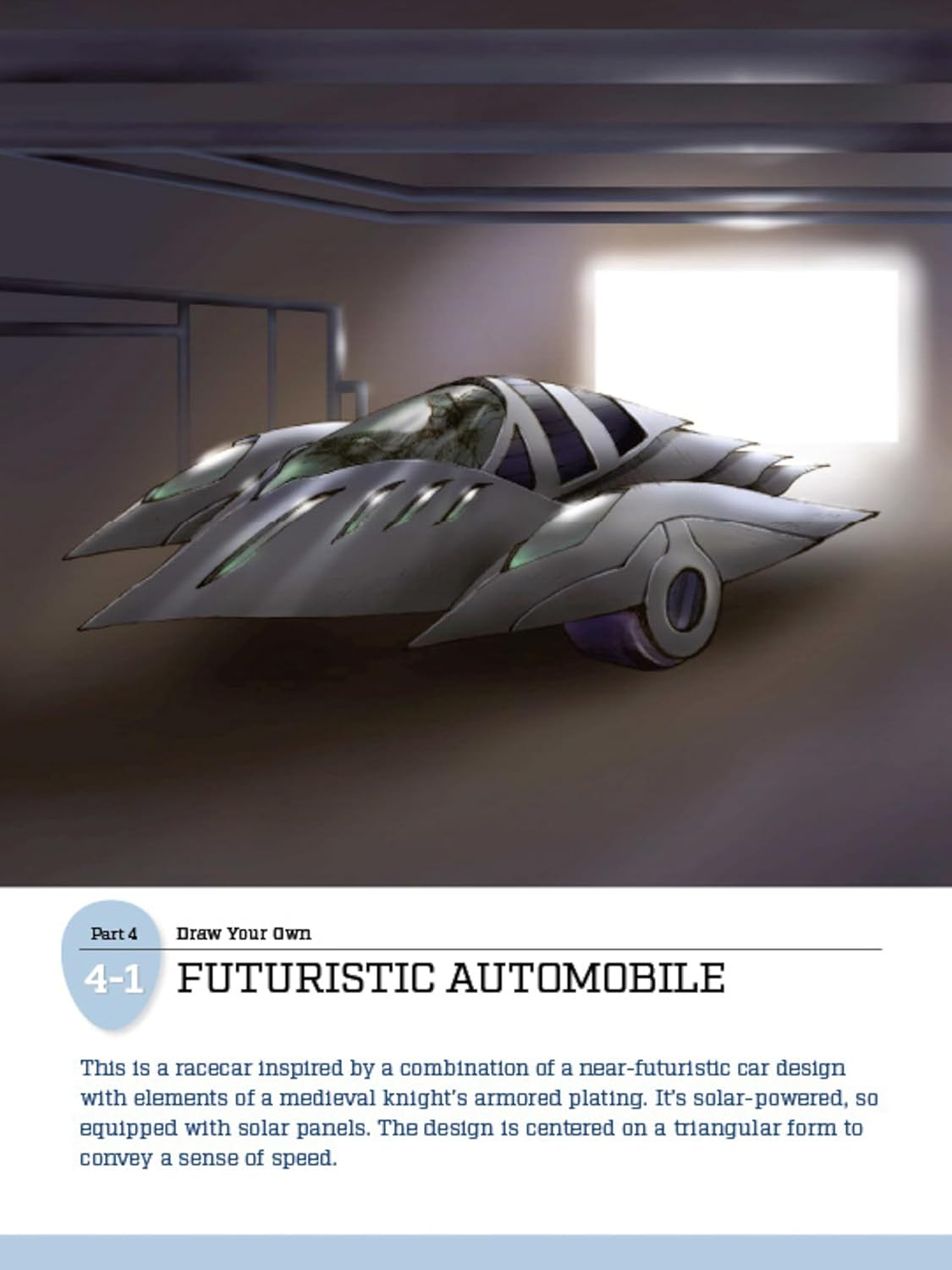 • Illustration techniques that allow you to create realistic three-dimensional vehicles: line, depth, shadow, coloration and rendering the surfaces of various materials