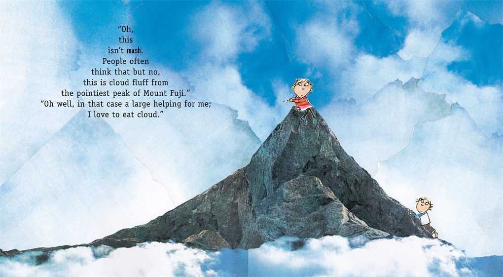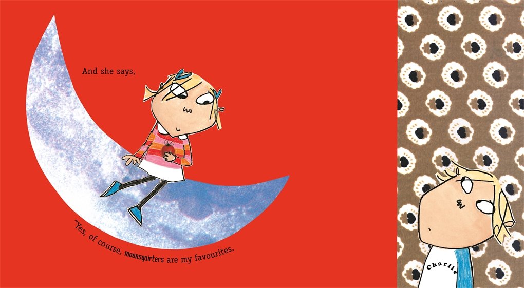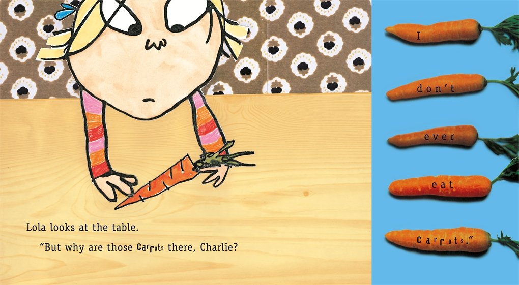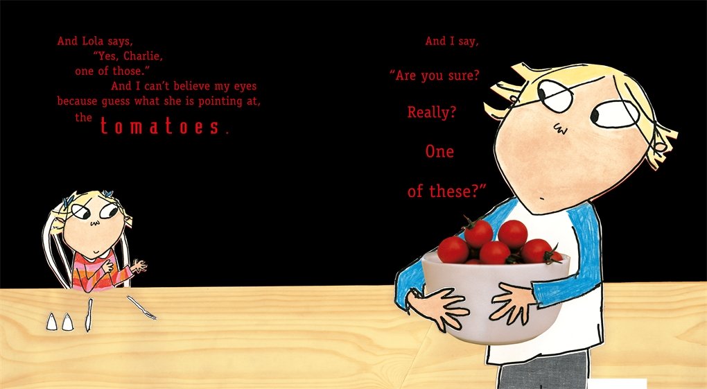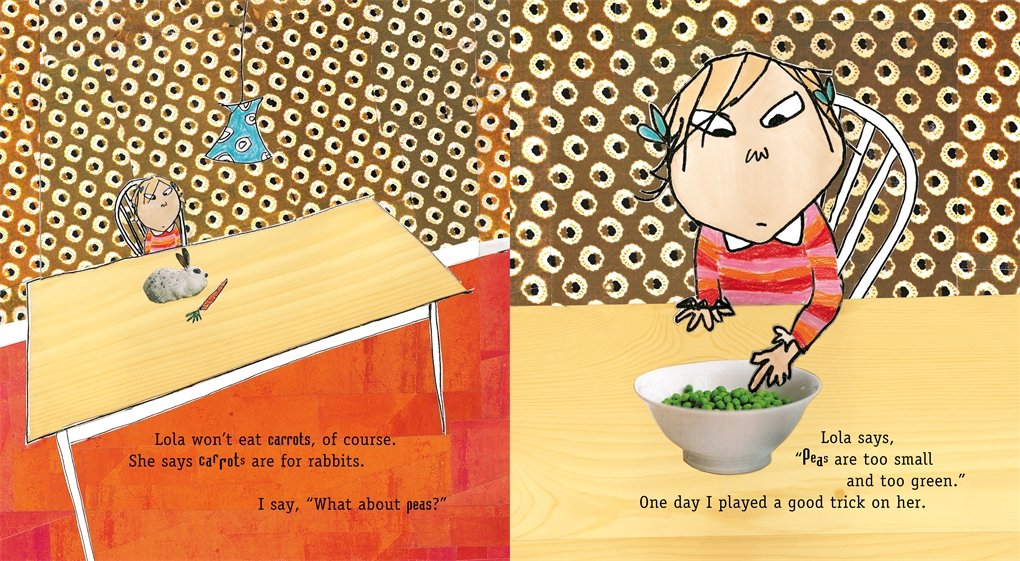 Lola will not peas. In fact she won't eat carrots, potatoes, mushrooms, cabbage or baked beans. And she will absolutely not ever NEVER eat a tomato. But when Charlie explains that peas are actually green drops from Greenland, and carrots are really orange twiglets from Jupiter, even Lola is tempted to clear her plate...