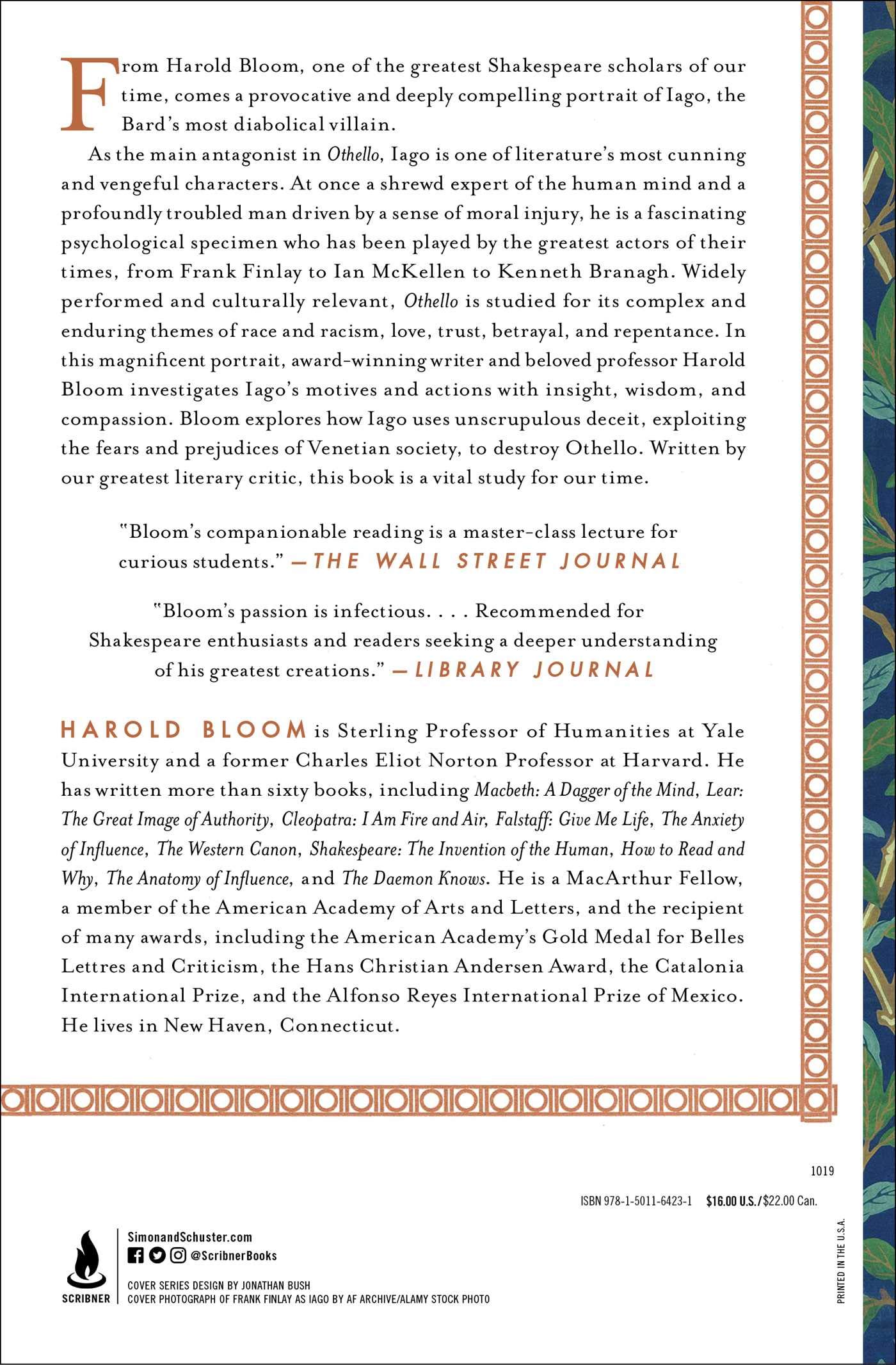 Bloom is mesmerizing in the classroom, treating Shakespeare’s characters like people he has known all his life. He delivers exhilarating intimacy and clarity in these pages, writing about his shifting understanding—over the course of his own lifetime—of this endlessly compelling figure, so that Iago also becomes an extraordinarily moving argument for literature as a path to and a measure of our humanity. “There are few readers more astute than Bloom” (Publishers Weekly), and his Iago is a provocative study for our time.