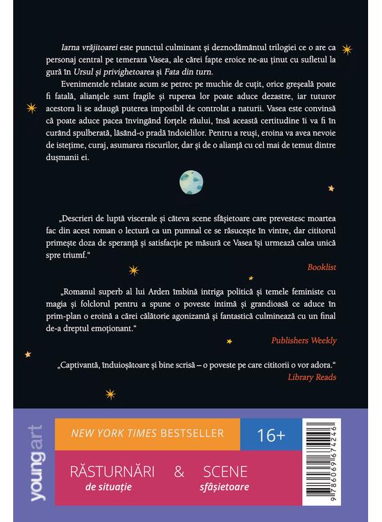 Iarna vrăjitoarei este punctul culminant și deznodământul trilogiei ce o are ca personaj central pe temerara Vasea, ale cărei fapte eroice ne-au ținut cu sufletul la gură în Ursul și privighetoarea și Fata din turn.