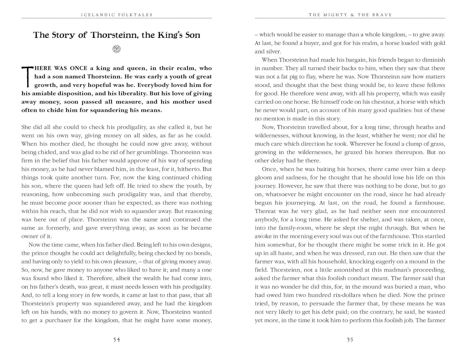 Icelandic folktales are the close cousins of Viking fairy stories, although perhaps a little darker in their tone, but they share many of the same themes of innocence and trickery, triumph of good sense over pride, and all with a strong moral message. One particular characteristic though is that often the prince is rescued by the princess who has suffered much hardship in the journey to rescue the foolish male from the clutches of an ogre or a wicked crone. Stories include: The Story of the Three Princes, Hildur, Queen of Elves, The Giantess and the Granite Boat, The Magic Scythe.