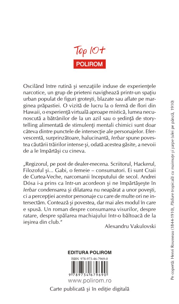 „Regizorul, pe post de dealer-mecena. Scriitorul, Hackerul, Filozoful şi... Gabi, o femeie – consumatori. Ei sunt Craii de Curtea-Veche, narcomanii începutului de secol. Andrei Dósa i-a prins ca într-un acordeon şi ne împărtăşeşte în Ierbar condensarea şi dilatarea nu neapărat a unor poveşti, ci a percepţiei acestor personaje cu care de multe ori ne intersectăm. Contează şi povestea, dar mai ales modul în care e spusă. Un roman despre consumarea visurilor, despre ratare, despre spălarea machiajului într-o băltoacă de la ieşirea din club.“ (Alexandru Vakulovski)