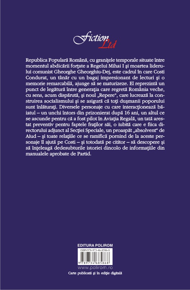 Republica Populară Română, cu granițele temporale situate între momentul abdicării forțate a Regelui Mihai I și moartea liderului comunist Gheorghe Gheorghiu-Dej, este cadrul în care Costi Condurat, un tînăr cu un bagaj impresionant de lecturi și o memorie remarcabilă, ajunge să se maturizeze. El reprezintă un punct de legătură între generația care regretă România veche, cu sens, acum dispărută, și noul „Repere”, care lucrează la construirea socialismului și se asigură că toți dușmanii poporului sînt înlăturați. Diversele personaje cu care interacționează băiatul – un unchi întors din prizonierat după 16 ani, un altul ce se ascunde pentru că a fost pilot în Aviația Regală, un tată arestat preventiv pentru faptele fraților săi, o iubită care e fiica directorului adjunct al Secției Speciale, un proaspăt „absolvent” de Aiud – și toate relațiile ce se ramifică pornind de la aceste personaje îl ajută pe Costi – și totodată pe cititor – să descopere și să înțeleagă dedesubturile istoriei dincolo de informațiile din manualele aprobate de Partid.