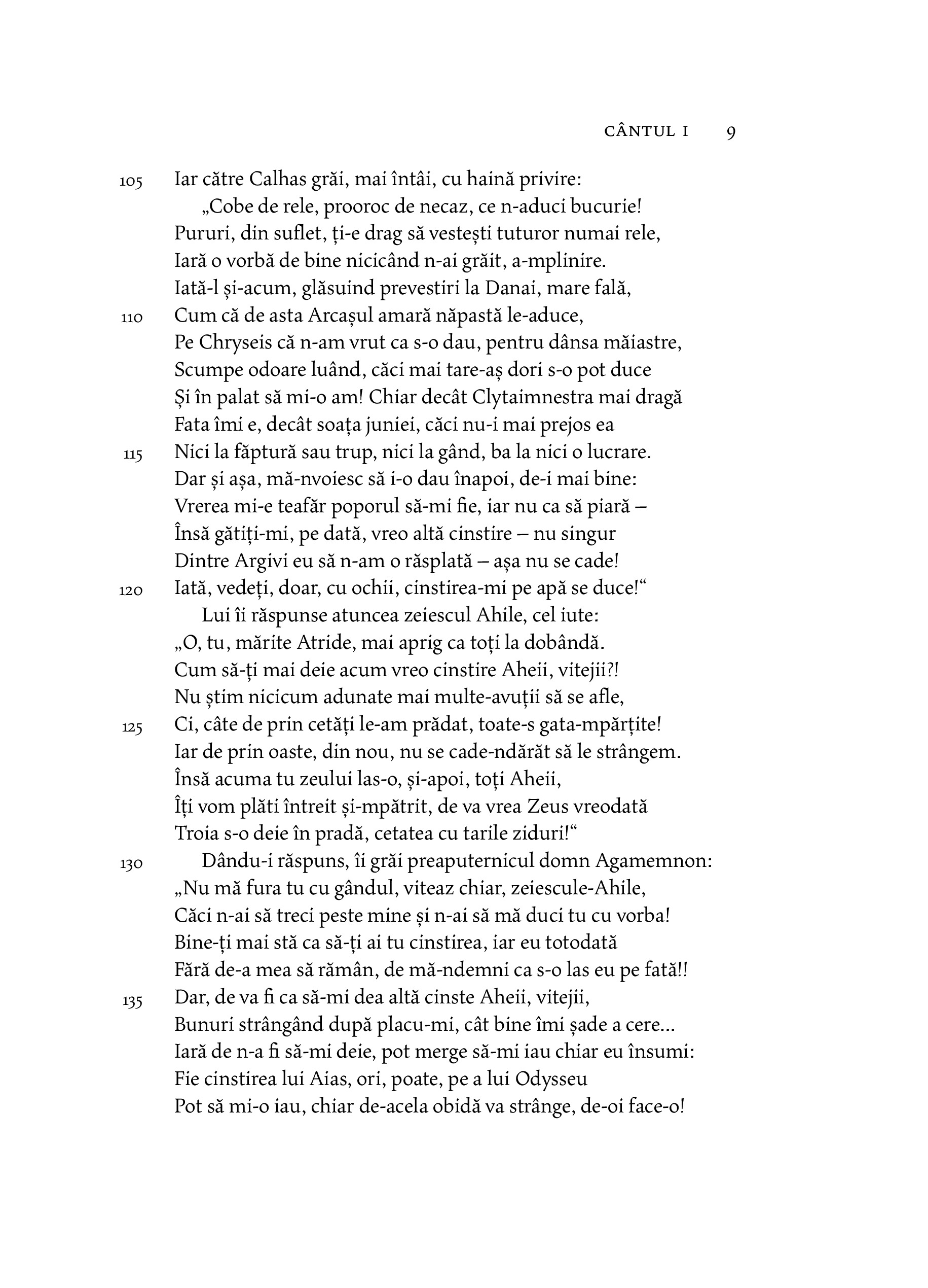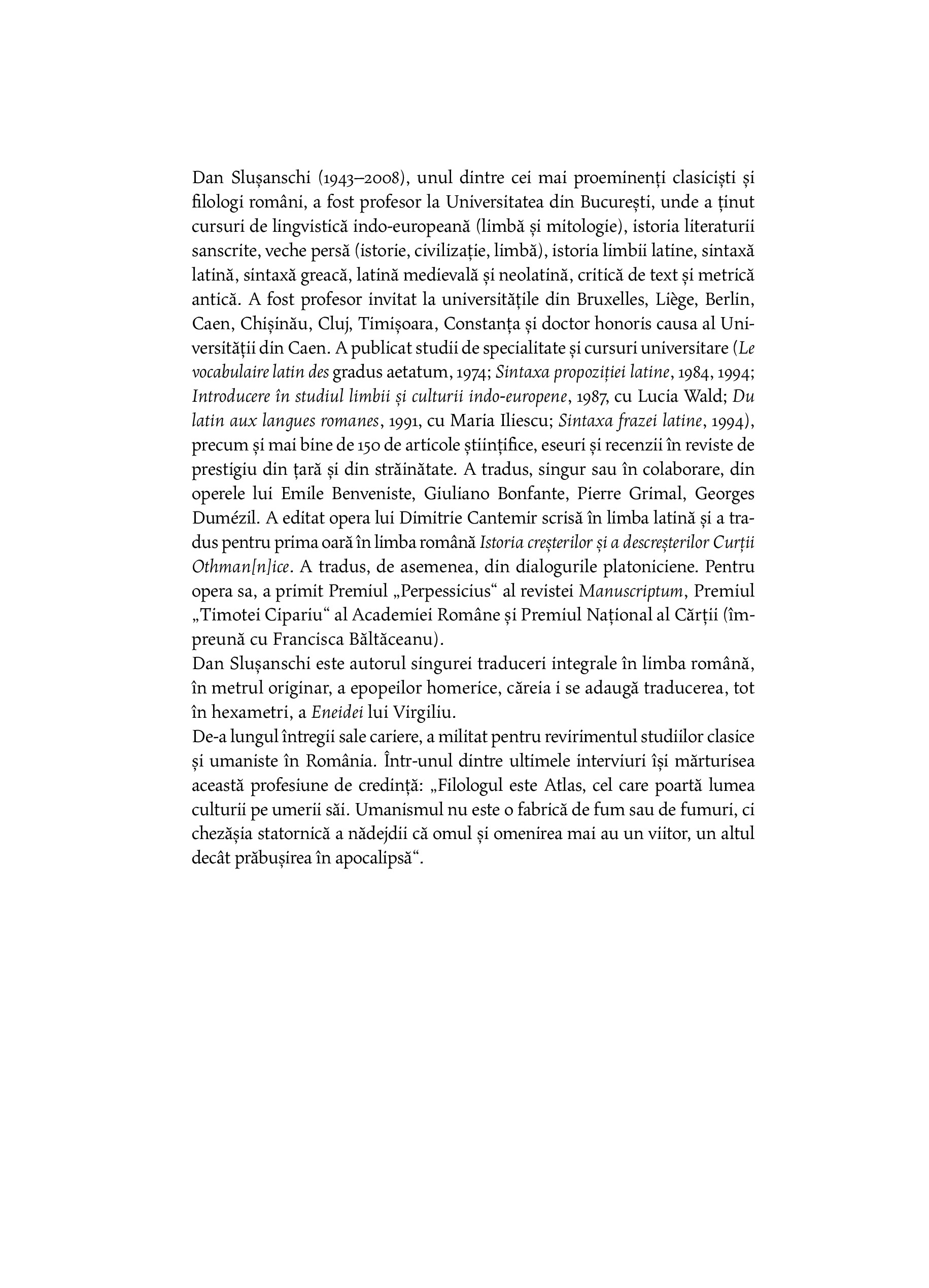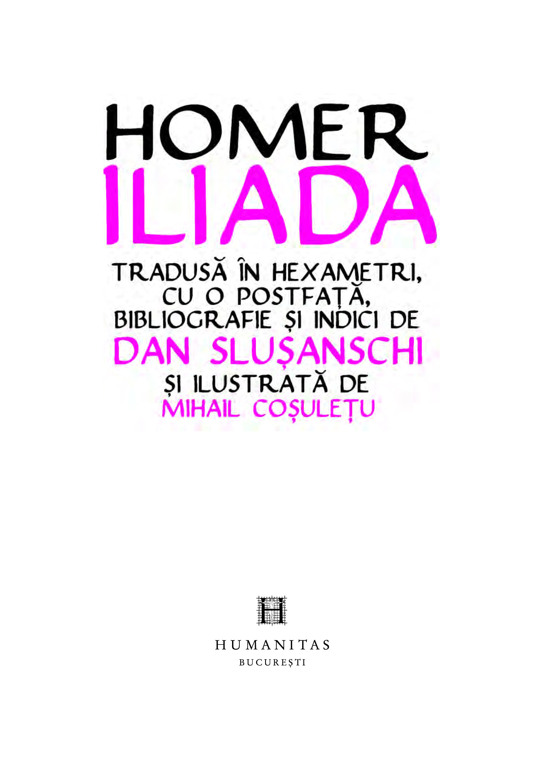 „Binevoitorul nostru cititor se va întreba, poate, cum de ne-am asumat curajul de a ne avânta într-o atât de temerară întreprindere, cum este aceea a unei noi traduceri a poemelor homerice, şi, mai cu seamă, a uneia dorite în hexametri. Vom mărturisi, prin urmare, deschis că am ajuns treptat să simţim această înclinare nu ca pe o îndrăzneală, ci ca pe o necesitate de neocolit: nimeni nu poate tăgădui faptul că orice lume civilizată, orice naţiune cultivată şi cu respect pentru sine are îndatorirea de a-şi regândi marii autori odată cu fiecare nouă generaţie şi de a-i traduce iarăşi, măcar tot la două generaţii, căutând să se apropie mereu mai mult de spiritul şi de expresia acestora.“ — DAN SLUŞANSCHI