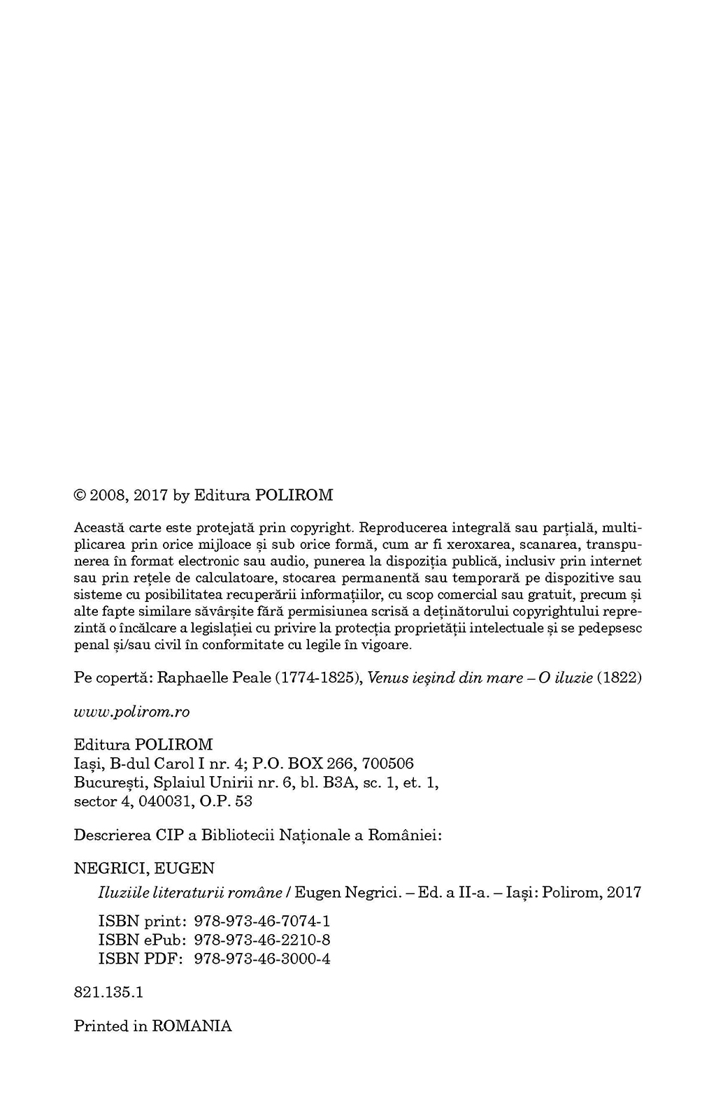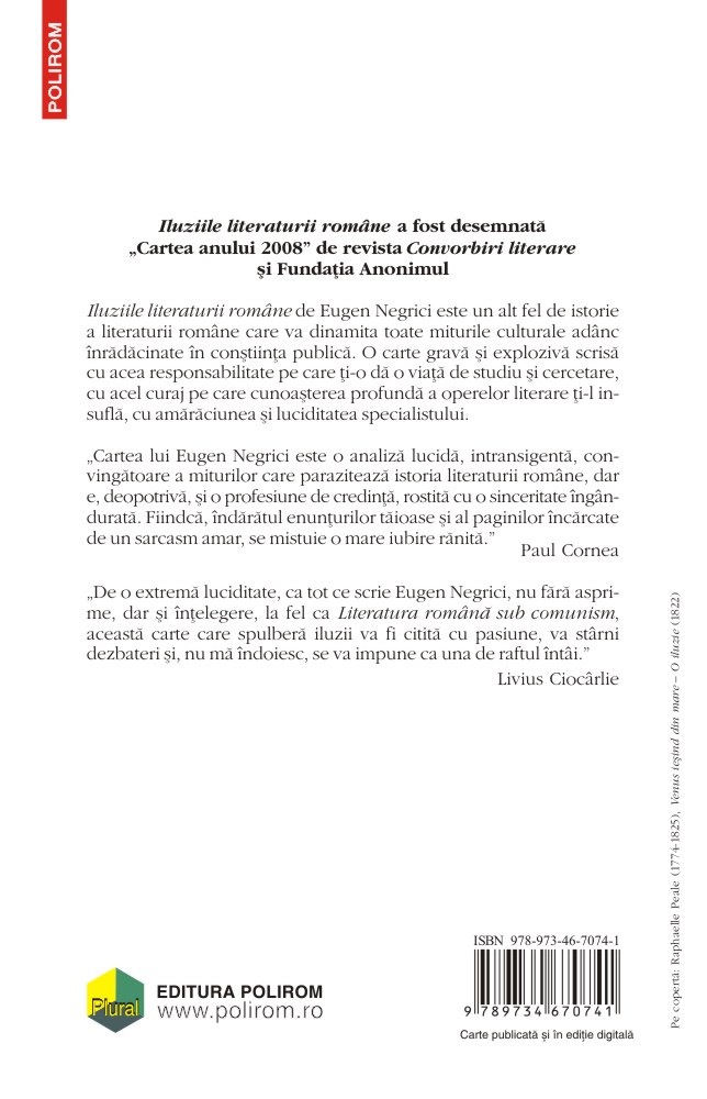 Iluziile literaturii române de Eugen Negrici este un alt fel de istorie a literaturii române care va dinamita toate miturile culturale adînc înrădăcinate în conştiinţa publică. O carte gravă şi explozivă scrisă cu acea responsabilitate pe care ţi-o dă o viaţă de studiu şi cercetare, cu acel curaj pe care cunoaşterea profundă a operelor literare ţi-l insuflă, cu amărăciunea şi luciditatea specialistului.