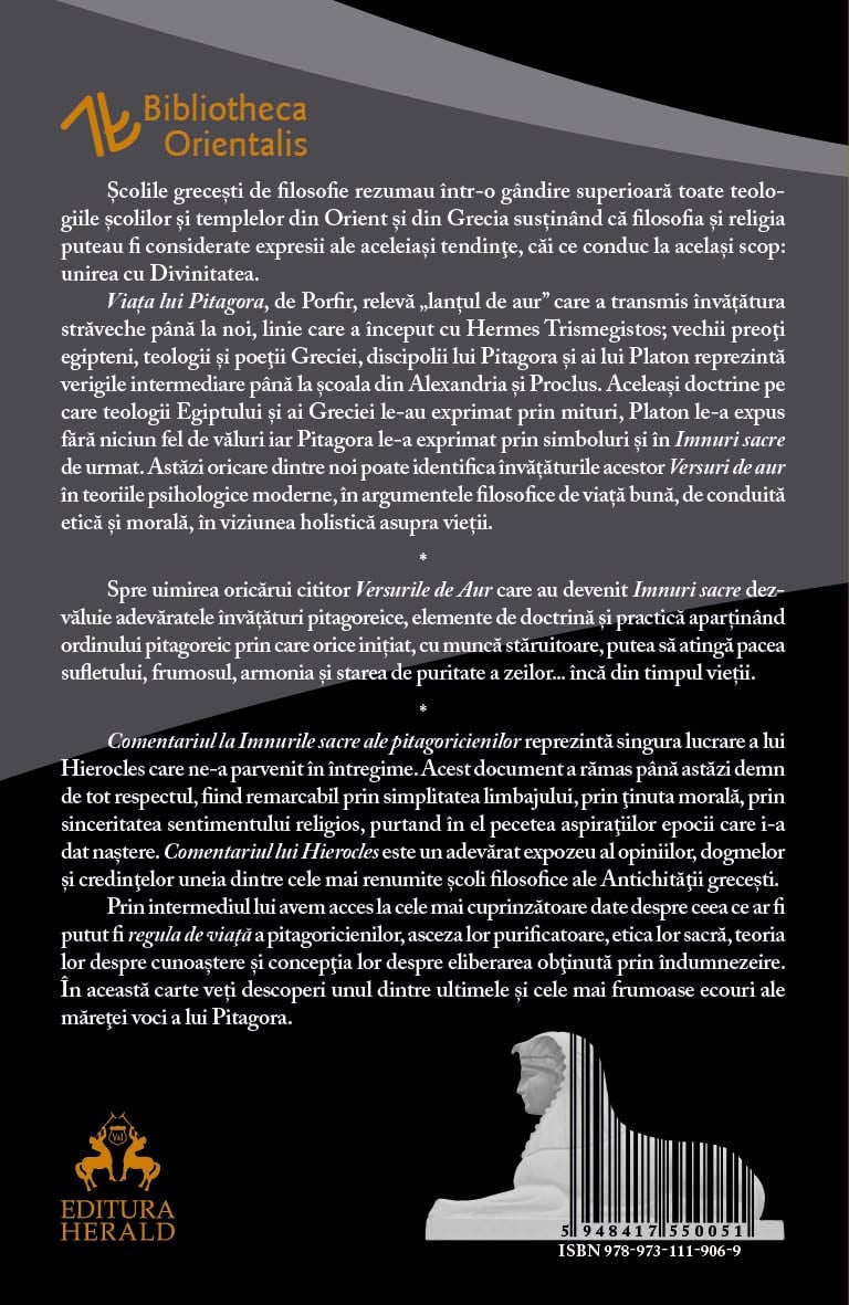 Viata lui Pitagora, de Porfir, releva „lantul de aur” care a transmis invatatura straveche pana la noi, linie care a inceput cu Hermes Trismegistos; vechii preoti egipteni, teologii si poetii Greciei, discipolii lui Pitagora si ai lui Platon reprezinta verigile intermediare pana la scoala din Alexandria si Proclus. Aceleasi doctrine pe care teologii Egiptului si ai Greciei le-au exprimat prin mituri, Platon le-a expus fara niciun fel de valuri iar Pitagora le-a exprimat prin simboluri si in Imnuri sacre de urmat. Astazi oricare dintre noi poate identifica invataturile acestor Versuri de aur in teoriile psihologice moderne, in argumentele filosofice de viata buna, de conduita etica si morala, in viziunea holistica asupra vietii. Spre uimirea oricarui cititor Versurile de Aur care au devenit Imnuri sacre dezvaluie adevaratele invataturi pitagoreice, elemente de doctrina si practica apartinand ordinului pitagoreic prin care orice initiat, cu munca staruitoare, putea sa atinga pacea sufletului, frumosul, armonia si starea de puritate a zeilor... inca din timpul vietii.