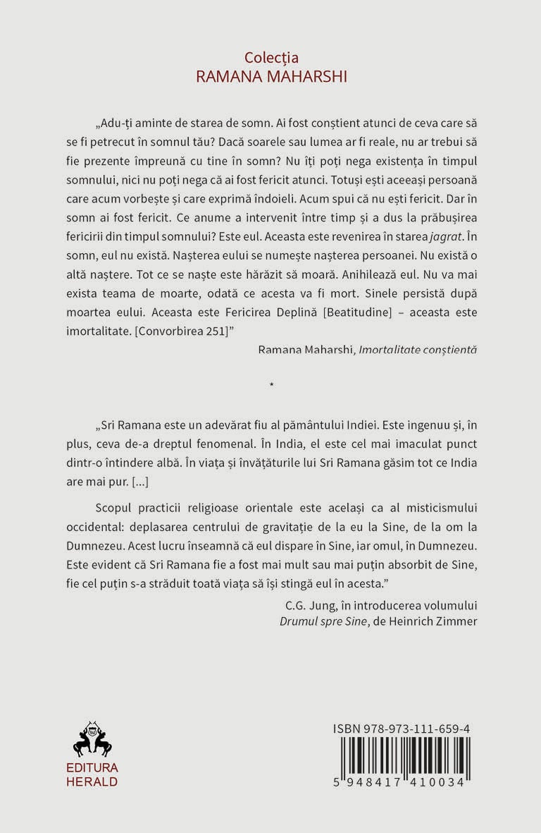 „Adu-ti aminte de starea de somn. Ai fost constient atunci de ceva care sa se fi petrecut in somnul tau? Daca soarele sau lumea ar fi reale, nu ar trebui sa fie prezente impreuna cu tine in somn? Nu iti poti nega existenta in timpul somnului, nici nu poti nega ca ai fost fericit atunci. Totusi esti aceeasi persoana care acum vorbeste si care exprima indoieli. Acum spui ca nu esti fericit. Dar in somn ai fost fericit. Ce anume a intervenit intre timp si a dus la prabusirea fericirii din timpul somnului? Este eul. Aceasta este revenirea in starea jagrat. In somn, eul nu exista. Nasterea eului se numeste nasterea persoanei. Nu exista o alta nastere. Tot ce se naste este harazit sa moara. Anihileaza eul. Nu va mai exista teama de moarte, odata ce acesta va fi mort. Sinele persista dupa moartea eului. Aceasta este Fericirea Deplina [Beatitudine] – aceasta este imortalitate. [Convorbirea 251]”
