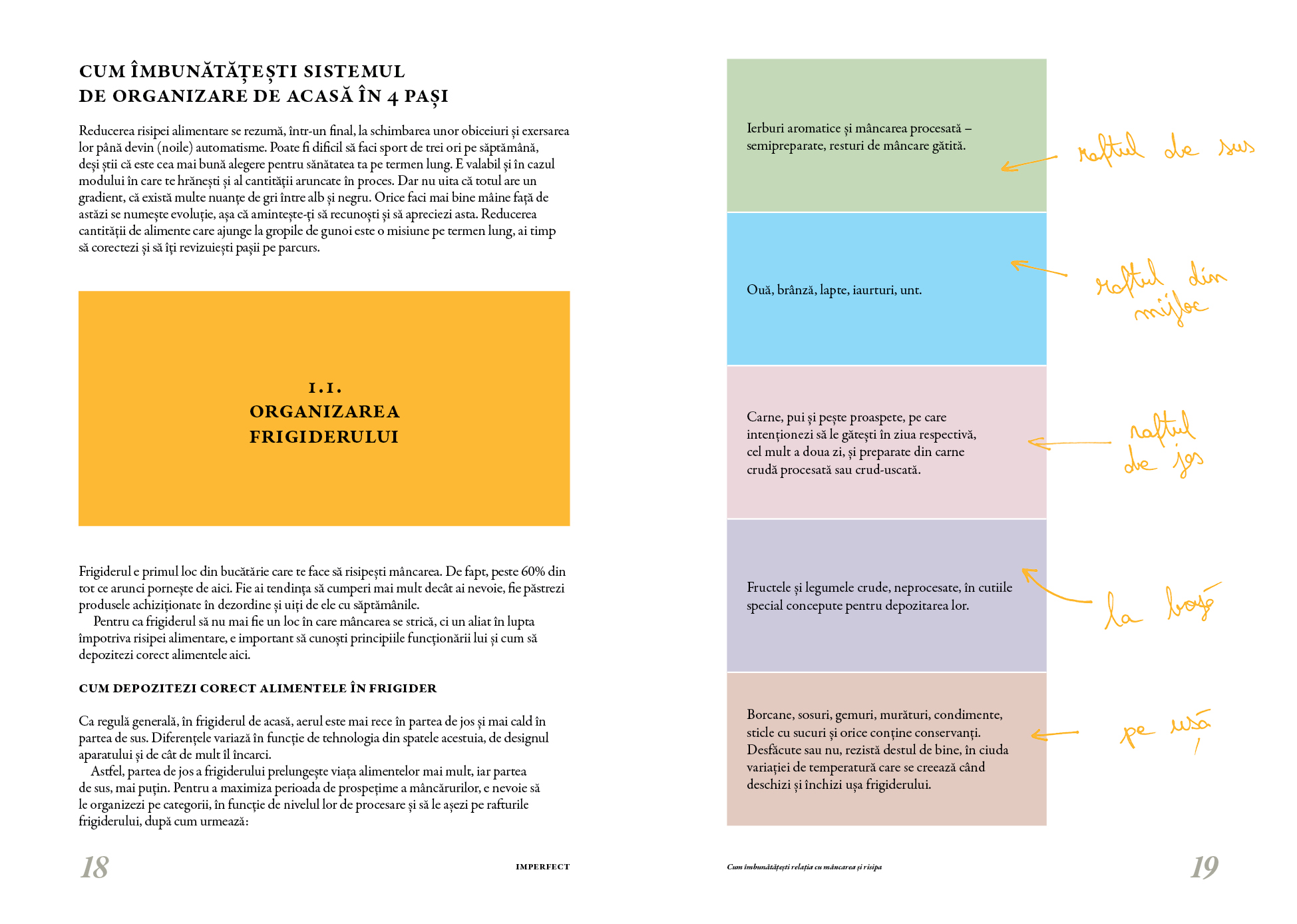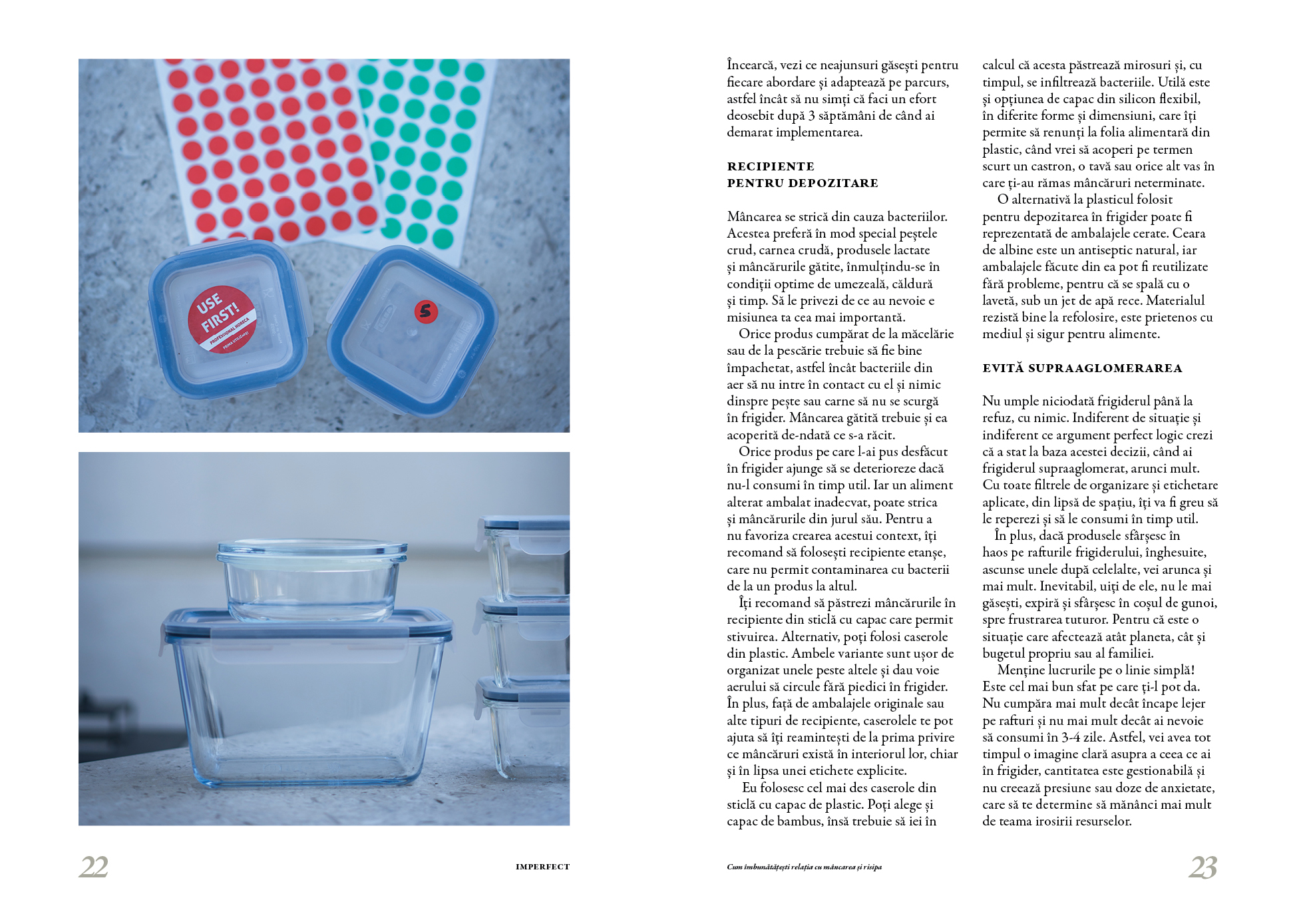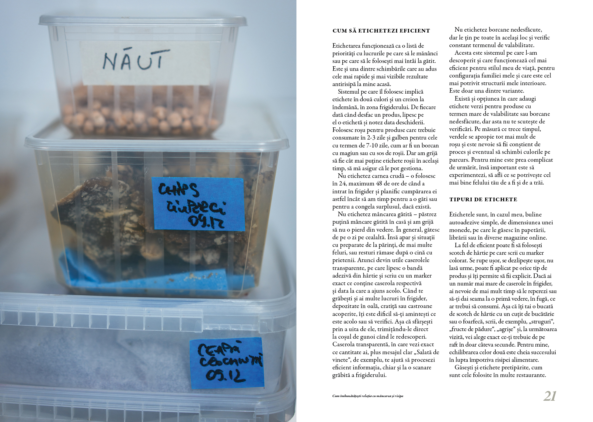 "Prin natura temelor atinse, această carte se poate integra conceptual în curentul zero waste. Dintr-o perspectivă mai largă, aceea a dezvoltării unui sistem, ea cuprinde și o sumă de mecanisme și valori care previn irosirea resurselor de orice fel, ajutandu-te să obții satisfacția unei relații mai echilibrate cu mâncarea. Sunt aici să facem echipă pentru mai puțină risipă acasă, cu soluții adaptate nevoilor, culturii, infrastructurii, provocărilor și oportunităților pe care le aduce traiul în România de astăzi. Îți propun un sistem decizional eficientizat de-a lungul unei decade, strategii mai inteligente de cumpărături, metode de depozitare, pârghii de organizare eficientă și o bază de formule, rețete și metode de conservare care te pot ajuta să adopți o atitudine mai sustenabilă, care duce la mai puțină risipă alimentară".