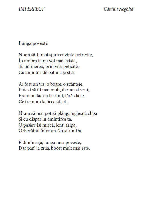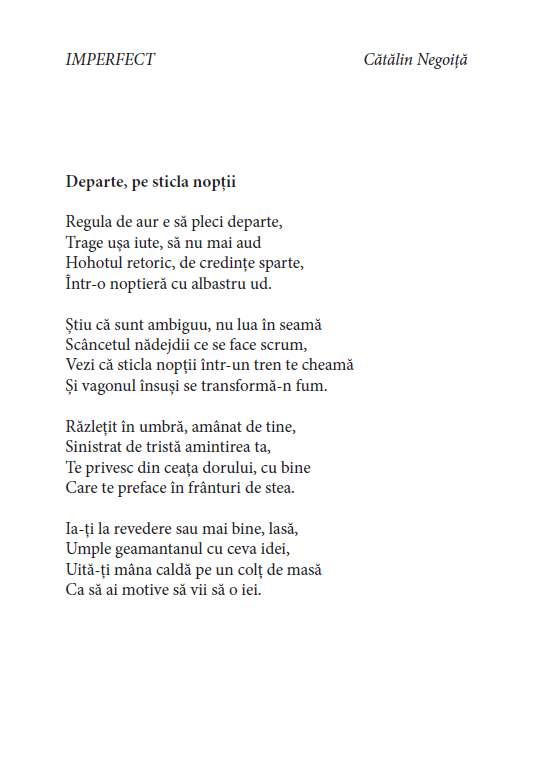 Numai un om curajos sau un inconștient și-o permite. Cătălin Negoiță este, credem, curajos. În versurile lui nu căutăm forma, nu căutăm norma, ci căutăm Esența. Când citim cartea ne gândim la sufletul și EUL Imperfect al unui creator autentic.
