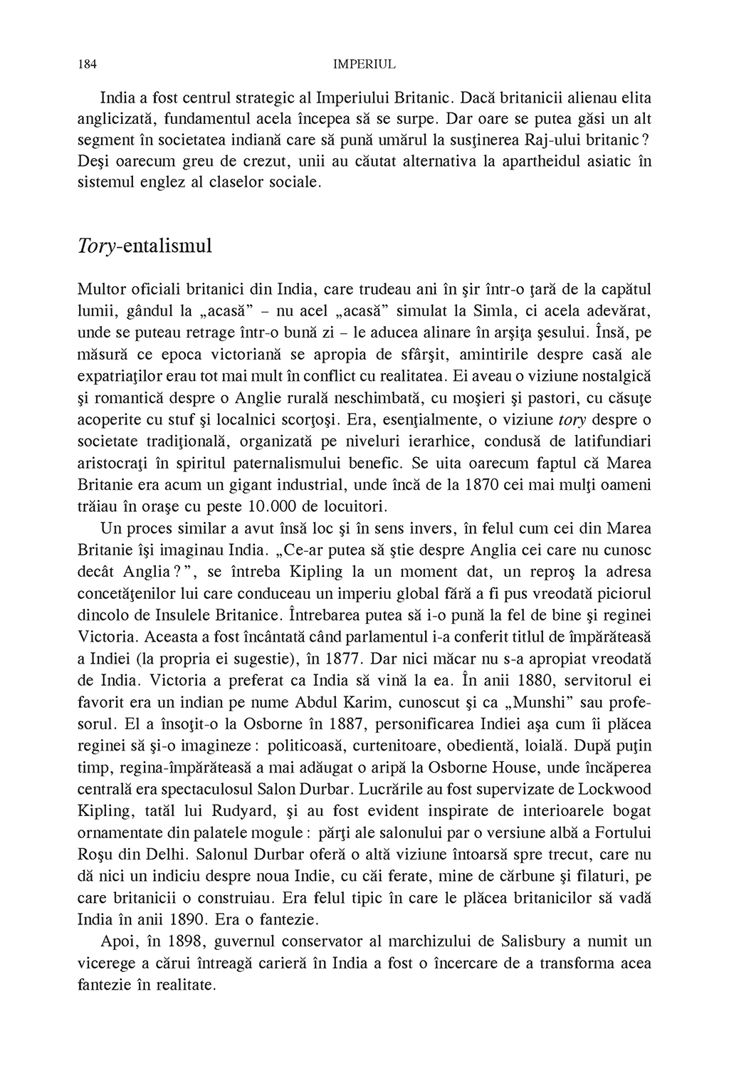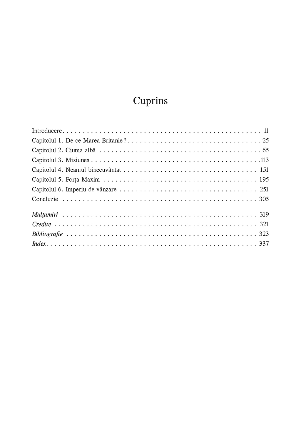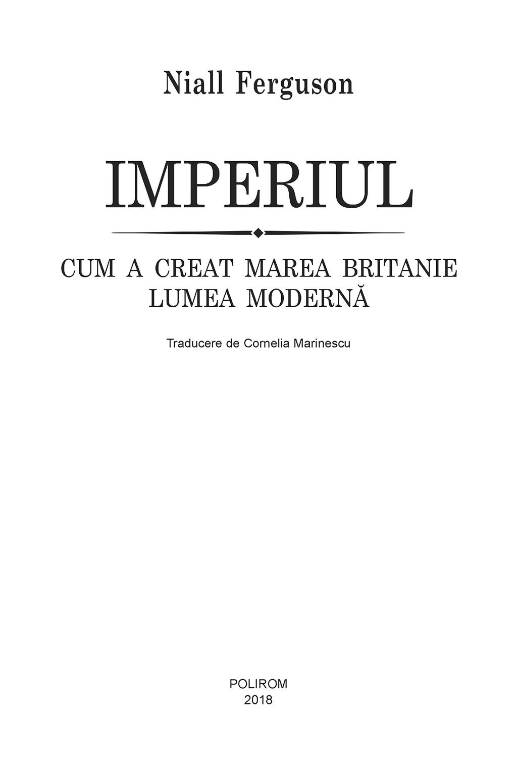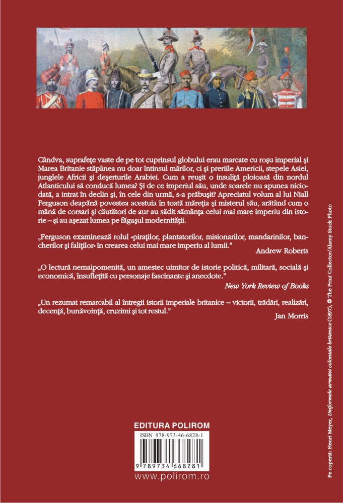 Cîndva, suprafeţe vaste de pe tot cuprinsul globului erau marcate cu roşu imperial şi Marea Britanie stăpînea nu doar întinsul mărilor, ci şi preriile Americii, stepele Asiei, junglele Africii şi deşerturile Arabiei. Cum a reuşit o insuliţă ploioasă din nordul Atlanticului să conducă lumea? Şi de ce imperiul său, unde soarele nu apunea niciodată, a intrat în declin şi, în cele din urmă, s-a prăbuşit? Apreciatul volum al lui Niall Ferguson deapănă povestea acestuia în toată măreţia şi misterul său, arătînd cum o mînă de corsari şi căutători de aur au sădit sămînţa celui mai mare imperiu din istorie – şi au aşezat lumea pe făgaşul modernităţii.