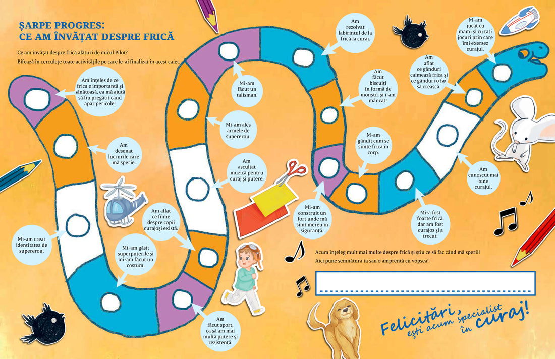 Împrietenește-te cu Frica, în completarea cărții Ioanei Chicet-Macoveiciuc Pilot, băieţelul care se temea de (aproape) tot, este un caiet plin de activități utile care vă vor ajuta să vă gestionați ușor toate temerile provocate de pericole reale sau imaginare.