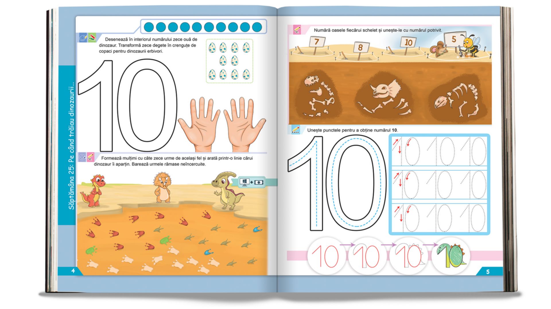 Dinozauri – specii, evoluție, înmulțire, numărul 10 (predare), exerciții grafice – linia șerpuită – trasare spontană, recapitulare litere, cifre și forme geometrice, despărțiri în silabe, dezvoltarea atenției și a gândirii logice