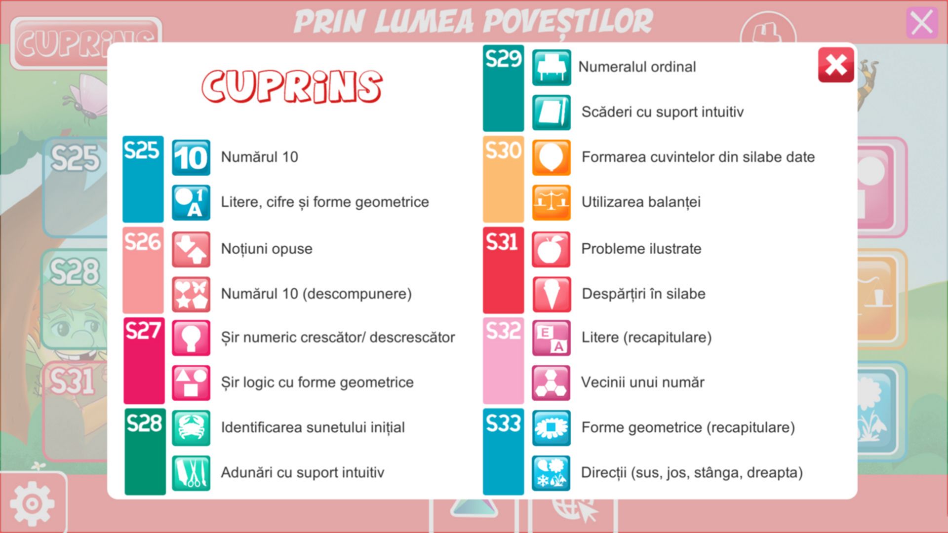 Elemente de interculturalitate/ multiculturalitate, șir logic, formarea unor cuvinte cu silabe date (cu suport intuitiv), unități neconvenționale de măsură pentru greutate, adunări și scăderi (cu suport intuitiv), exerciții grafice - combinații de linii, dezvoltarea atenției și a gândirii logice