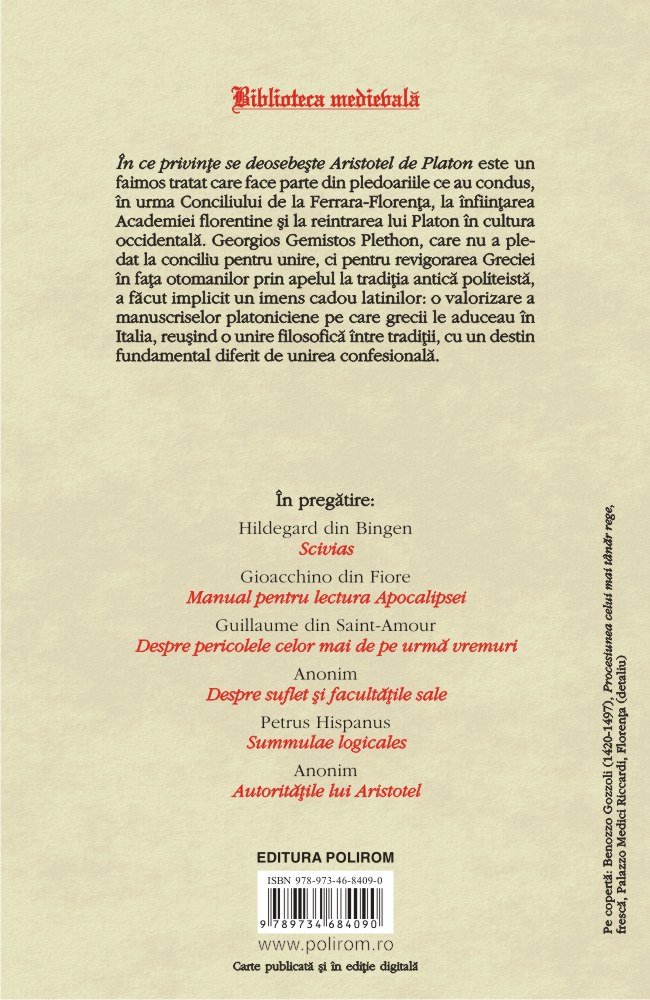 În ce privințe se deosebește Aristotel de Platon este un faimos tratat care face parte din pledoariile ce au condus, în urma Conciliului de la Ferrara-Florența, la înființarea Academiei florentine și la reintrarea lui Platon în cultura occidentală. Georgios Gemistos Plethon, care nu a pledat la conciliu pentru unire, ci pentru revigorarea Greciei în fața otomanilor prin apelul la tradiția antică politeistă, a făcut implicit un imens cadou latinilor: o valorizare a manuscriselor platoniciene pe care grecii le aduceau în Italia, reușind o unire filosofică între tradiții, cu un destin fundamental diferit de unirea confesională.