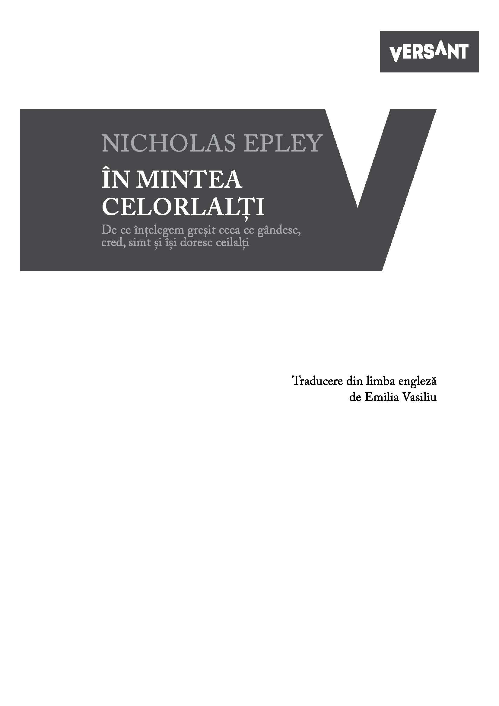 În cartea „În mintea celolrlați”, Nicholas Epley se apleacă asupra abilității noastre de a citi mintea celorlalți, argumentând că noi credem că suntem mai abili în a citi gândurile și intențiile celorlalți decât sunt de fapt capabili. Epley ne arată care sunt greșelile pe care le facem când încercăm să ne dăm seama ce simt și vor cei din jur, dar oferă și o altă perspectivă despre cum să înțelegem atât propriile stereotipuri cât și pe ale celorlalți.