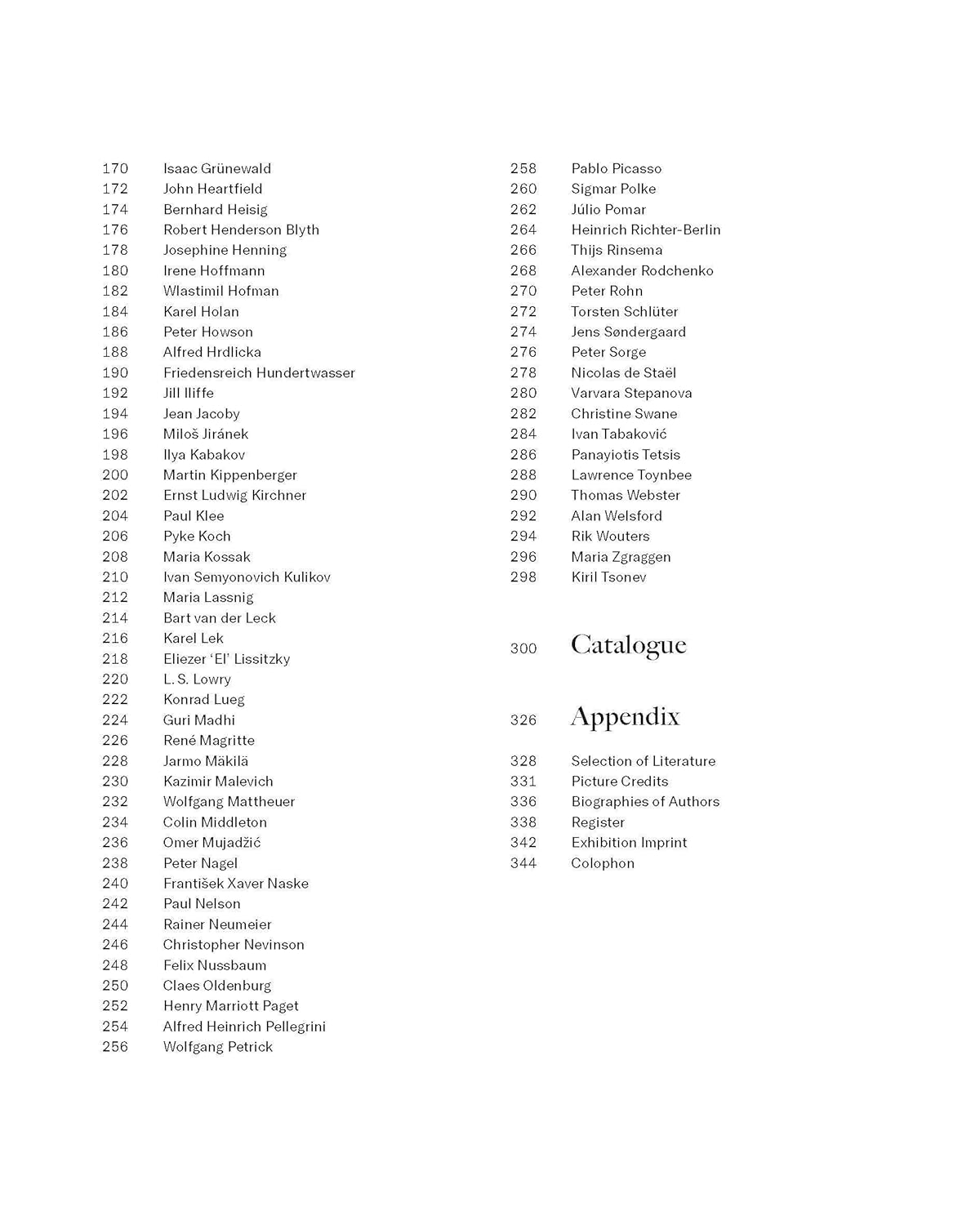 Artists: Sybil Andre, Dieter Asmus, Willi Baumeister, Cecil Walter Hardy Beaton, Peter Blake, Umberto Boccioni, Carlo Carrà, Ithell Colquhoun, Charles Cundall, Salvador Dalì, Giulio D'Anna, Raoul de Keyser, Nicolas de Staël, Alexander Deineka, Robert Delaunay, Brendan Ellis, George Eisler, Paul Feiler, Ludvig Find, Hubert Andrew Freeth, Fritz Genkinger, Harald Giersing, John Heartfield, Bernhard Heisig, Robert Henderson Blyth, Peter Howson, Hundertwasser, Miloš Jiránek, Ilja Kabakow, Ernst Ludwig Kirchner, Paul Klee, Pyke Koch, Maria Lassnig, Karel Lek, Elizer Lissitzky, Rene Magritte, Jarmo Mäkila, Kasimir Malewitsch, Colin Middleton, Joan Miró, Omer Mujadzic, Peter Nagel, František Xaver Naske, Paul Nelson, Rainer Neumaier, Christopher Nevinson, Felix Nussbaum, Claes Oldenburg, Wolfgang Petrik, Pablo Picasso, Sigmar Polke, Peter Rohn, Alexander Nikolajewitsch Samochwalow, Thorsten Schlüter, Valentin Sidorov, Jens Sondergaard, Warwara Fjodorowna Stepanowa, Ivan Tabakovic, Lawrence Tonybee, Bart van der Leck, Alan Welsford, Thomas Webster, Rik Wouters et al.