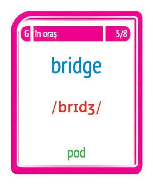 • 56 de carduri cu control al poziției. Fiecare card conține pe o față imaginea, iar pe verso cuvântul din limba engleză corespunzător, însoțit de traducere și transcriere fonetică;