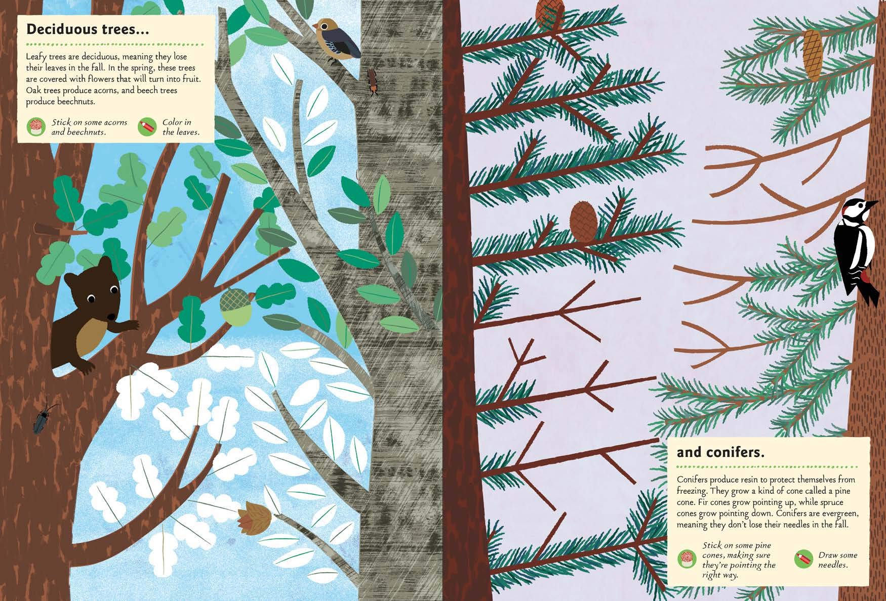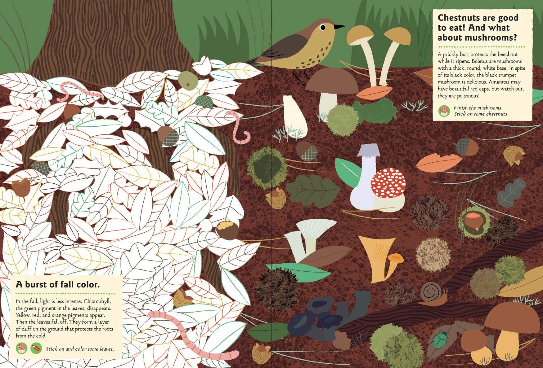 Did you know that fir cones grow pointing up while spruce cones grow pointing down, some kinds of mosses and ferns grow in trees, and bamboo trees can reach a height of sixty feet in forty-five days? The forest habitat is a complex ecosystem full of amazing plants, magnificent mushrooms, colorful berries, flowers, and more. Draw the roots of a tree, place blackberries on a bush, stick bells on the lily of the valley, and test your new knowledge with a short quiz at the end.