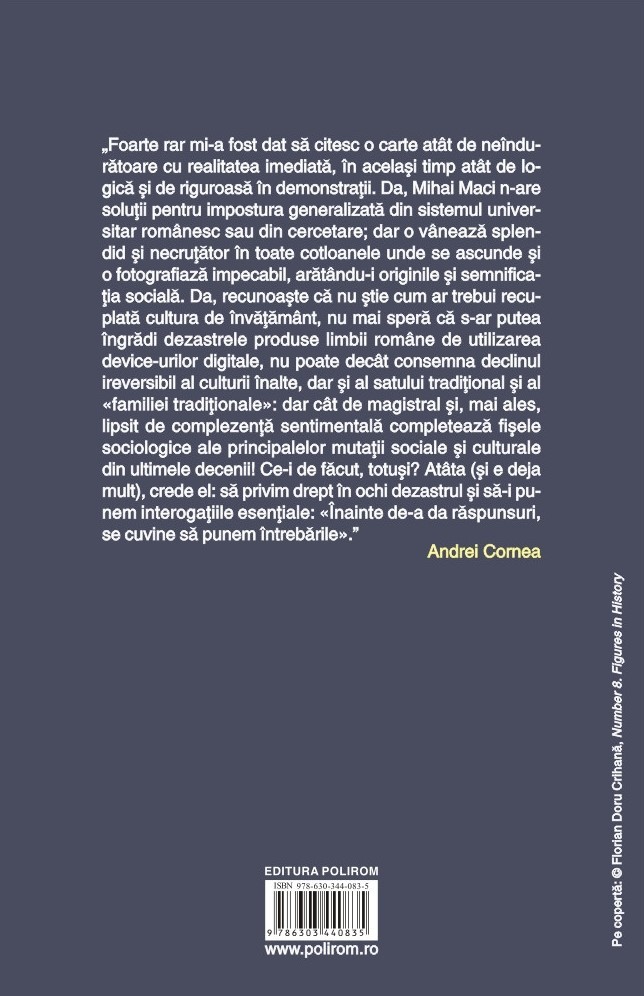 „Foarte rar mi-a fost dat să citesc o carte atât de neîndurătoare cu realitatea imediată, în același timp atât de logică și de riguroasă în demonstrații. Da, Mihai Maci n-are soluții pentru impostura generalizată din sistemul universitar românesc sau din cercetare; dar o vânează splendid și necruțător în toate cotloanele unde se ascunde și o fotografiază impecabil, arătându-i originile și semnificația socială. Da, recunoaște că nu știe cum ar trebui recuplată cultura de învățământ, nu mai speră că s-ar putea îngrădi dezastrele produse limbii române de utilizarea device-urilor digitale, nu poate decât consemna declinul ireversibil al culturii înalte, dar și al satului tradițional și al «familiei tradiționale»: dar cât de magistral și, mai ales, lipsit de complezență sentimentală completează fișele sociologice ale principalelor mutații sociale și culturale din ultimele decenii! Ce-i de făcut, totuși? Atâta (și e deja mult), crede el: să privim drept în ochi dezastrul și să-i punem interogațiile esențiale: «Înainte de-a da răspunsuri, se cuvine să punem întrebările».” (Andrei Cornea)