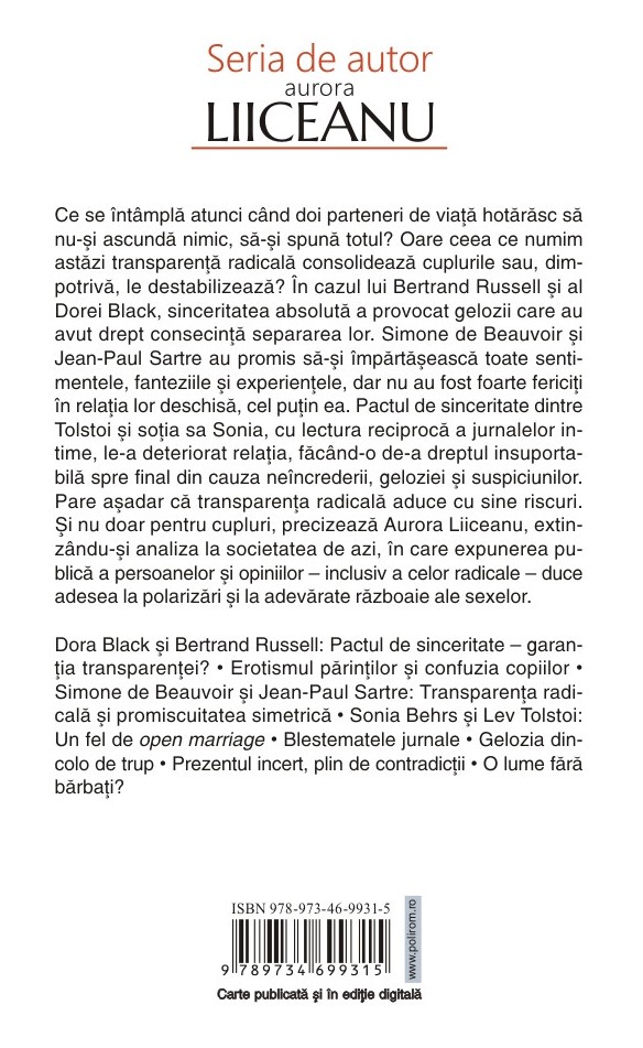 În cazul lui Bertrand Russell și al Dorei Black, sinceritatea absolută a provocat gelozii care au avut drept consecință separarea lor. Simone de Beauvoir și Jean-Paul Sartre au promis să-și împărtășească toate sentimentele, fanteziile și experiențele, dar nu au fost foarte fericiți în relația lor deschisă, cel puțin ea. Pactul de sinceritate dintre Tolstoi și soția sa Sonia, cu lectura reciprocă a jurnalelor intime, le-a deteriorat relația, făcând-o de-a dreptul insuportabilă spre final din cauza neîncrederii, geloziei și suspiciunilor. Pare așadar că transparența radicală aduce cu sine riscuri. Și nu doar pentru cupluri, precizează Aurora Liiceanu, extinzându-și analiza la societatea de azi, în care expunerea publică a persoanelor și opiniilor – inclusiv a celor radicale – duce adesea la polarizări și la adevărate războaie ale sexelor.