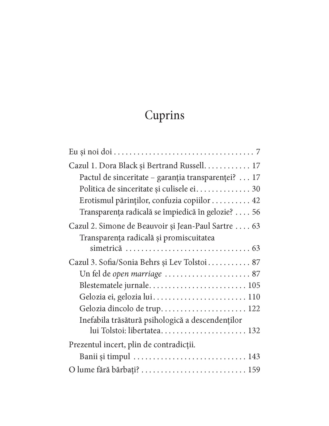 Dora Black și Bertrand Russell: Pactul de sinceritate – garanția transparenței? • Erotismul părinților și confuzia copiilor • Simone de Beauvoir și Jean-Paul Sartre: Transparența radicală și promiscuitatea simetrică • Sonia Behrs și Lev Tolstoi: Un fel de open marriage • Blestematele jurnale • Gelozia dincolo de trup • Prezentul incert, plin de contradicții • O lume fără bărbați?