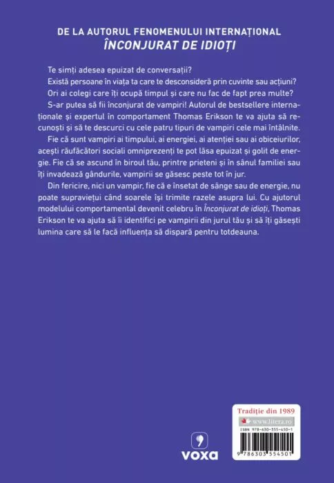 Cu ajutorul modelului comportamental devenit celebru în Înconjurat de idioți, Thomas Erikson te va ajuta să îi identifici pe vampirii din jurul tău și să îți găsești lumina care să le facă influența să dispară pentru totdeauna.