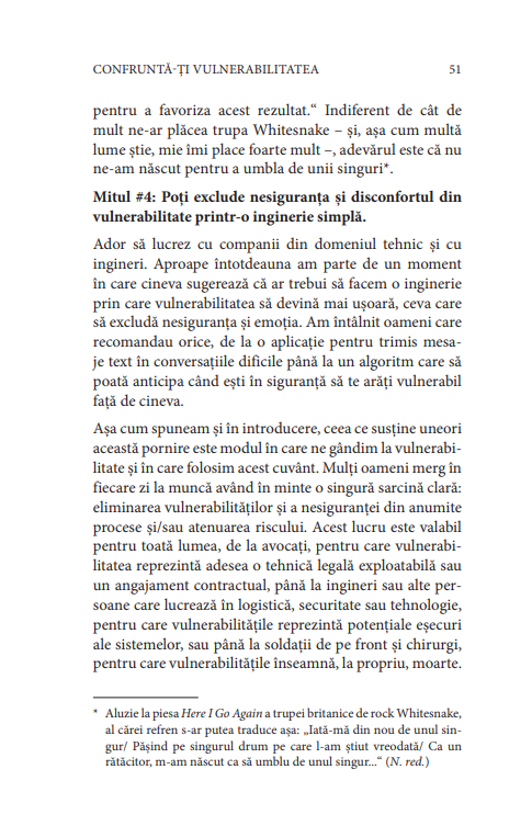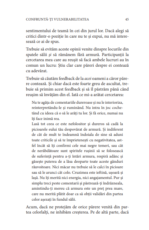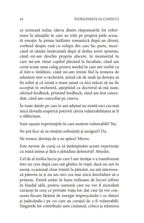 Îndrăznește să conduci sintetizează cei 20 de ani pe care Brene Brown i-a petrecut cercetând curajul, vulnerabilitatea, rușinea și empatia. Structurată în 4 părți care prezintă principii esențiale pentru leadershipul curajos, este o carte îndrăzneață tocmai pentru că autoarea își dezvăluie propriile slăbiciuni. Acceptă-i provocarea: învață și tu să îți confrunți vulnerabilitatea și renunță la armura grea, prima piedică în calea curajului. Vei afla că, pentru a îndrăzni să conduci, trebuie să îți redescoperi însușiri unice, profund umane.