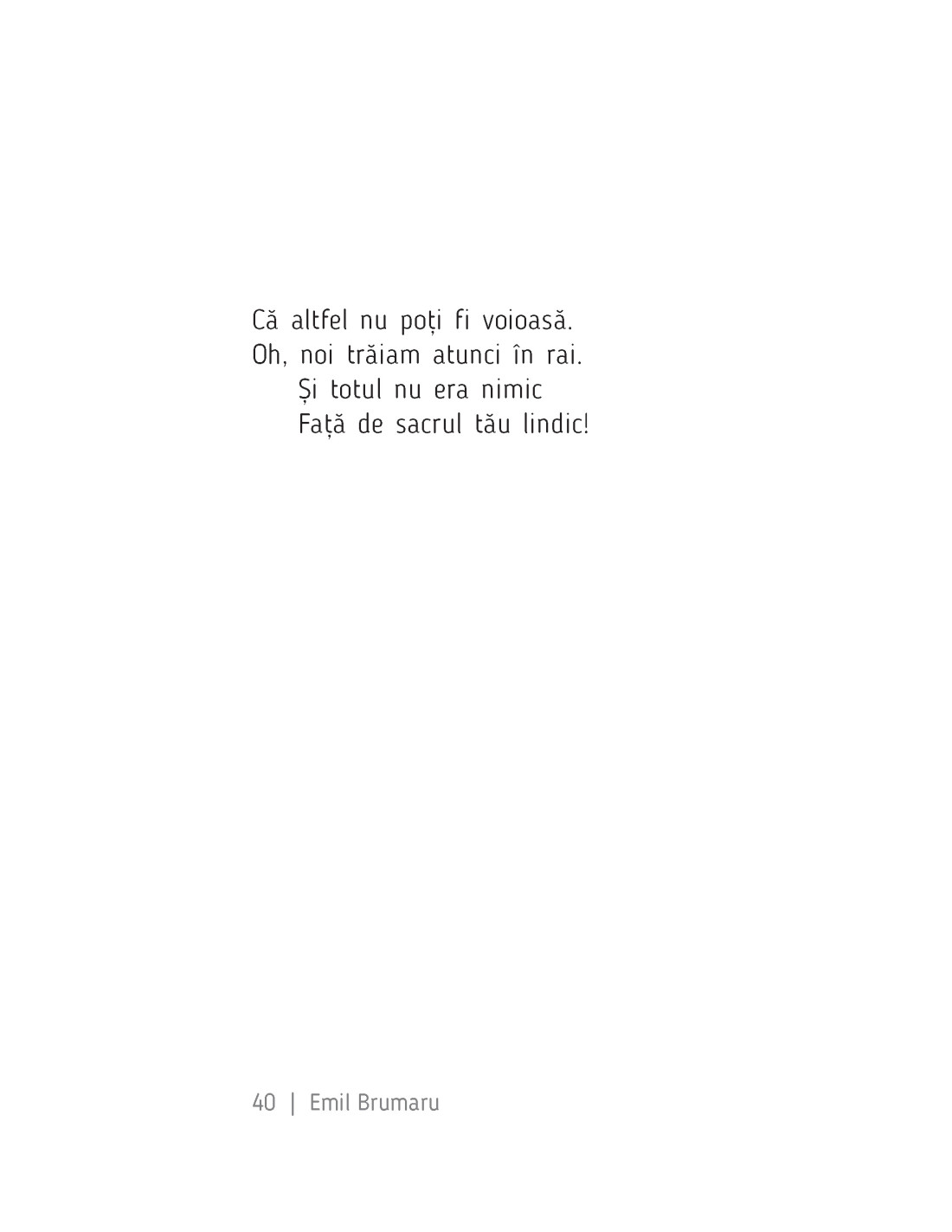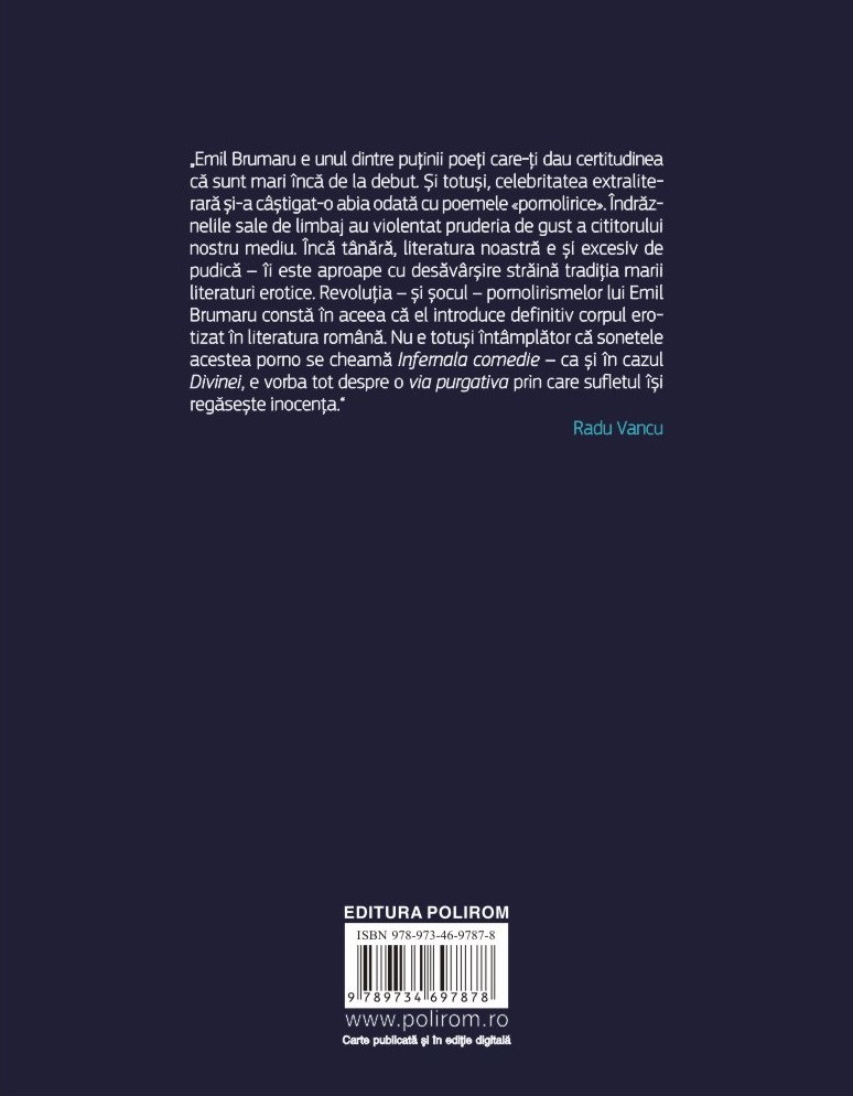 „Emil Brumaru e unul dintre puţinii poeţi care-ţi dau certitudinea că sunt mari încă de la debut. Și totuși, celebritatea extraliterară și-a câștigat-o abia odată cu poemele «pornolirice». Îndrăznelile sale de limbaj au violentat pruderia de gust a cititorului nostru mediu. Încă tânără, literatura noastră e și excesiv de pudică – îi este aproape cu desăvârșire străină tradiţia marii literaturi erotice. Revoluţia – și șocul – pornolirismelor lui Emil Brumaru constă în aceea că el introduce definitiv corpul erotizat în literatura română. Nu e totuși întâmplător că sonetele acestea porno se cheamă Infernala comedie – ca și în cazul Divinei, e vorba tot despre o via purgativa prin care sufletul își regăsește inocenţa.“ (Radu Vancu)