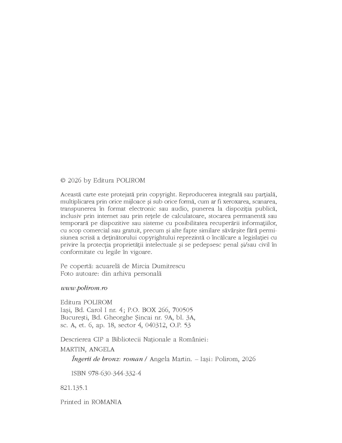 Construind o «contemporaneitate» multisituată, autoarea ne poartă, cu seducătoare dezinvoltură, de la Viena la Arad și Reșița, apoi la Gemlik, în Turcia, prin incursiuni narative palpitante, care pun accente polițiste sau foiletonistice pe evenimente, fără a le scoate de sub cupola unei saga memorabile. Dar simultan cu prezentul fără răgaz timpul nemuritor al familiei devine efigie prin monumentul funerar comandat și ridicat de Cezar în memoria alor săi. Astfel, «îngerii de bronz» fac legătura între «aici» și «dincolo», strămutând lumea Oteștilor și a urmașilor în eternitate.”