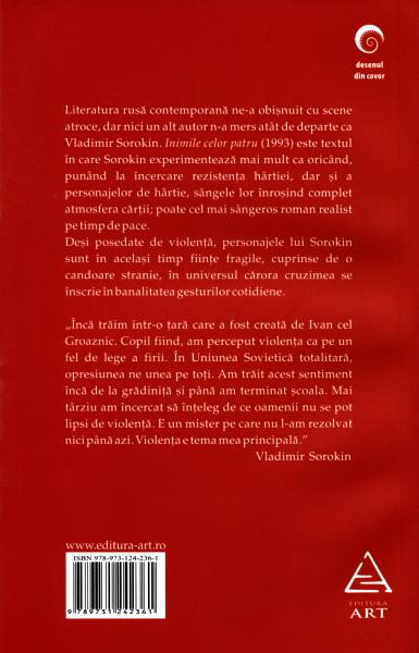 Literatura rusă contemporană ne-a obişnuit cu scene atroce, dar nici un alt autor n-a mers atât de departe ca Vladimir Sorokin. Inimile celor patru (1993) este textul în care Sorokin experimentează mai mult ca oricând, punând la încercare rezistenţa hârtiei, dar şi a personajelor de hârtie, sângele lor înroşind complet atmosfera cărţii; poate cel mai sângeros roman realist pe timp de pace