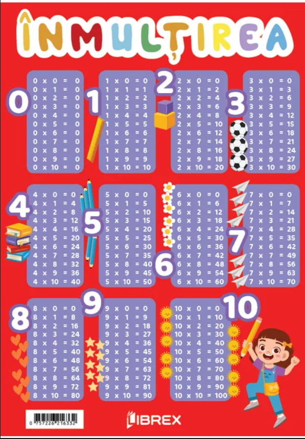 Plansa didactică tabla inmultirii contine operatiile aritmetice de baza necesare invatarii, recapitularii si evaluarii conceptelor specifice matematicii in invatamantul primar.