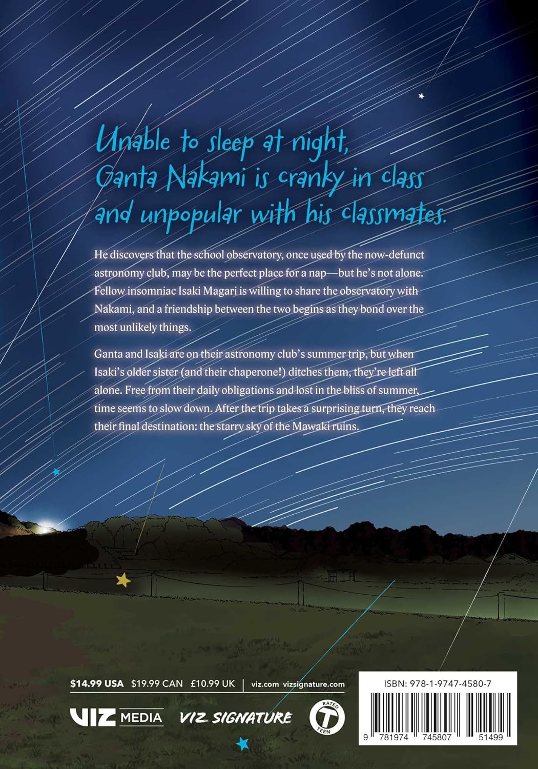 Ganta and Isaki are on their astronomy club’s summer trip, but when Isaki’s older sister (and their chaperone!) ditches them, they’re left all alone. Free from their daily obligations and lost in the bliss of summer, they feel time seeming to slow down. After the trip takes a surprising turn, they reach their final destination: the starry sky of the Mawaki ruins.