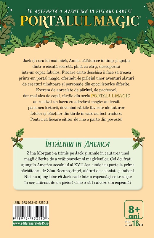 Zâna Morgan i-a trimis pe Jack și Annie în căutarea unei magii diferite de a vrăjitoarelor și magicienilor. Cei doi frați ajung în America secolului al XVII-lea, unde iau parte la prima sărbătoare de Ziua Recunoștinței, alături de coloniști și indieni. Nici nu ajung bine că Jack cade într-o capcană și se trezește în aer, atârnat de un picior! Cine o să-l salveze din capcană?