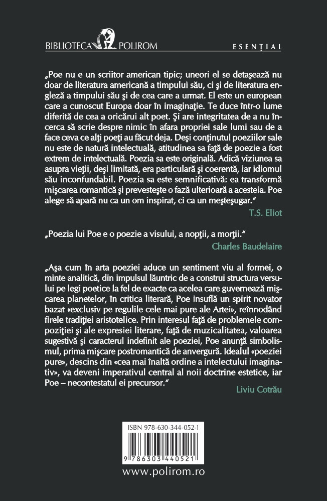„Poe nu e un scriitor american tipic; uneori el se detaşează nu doar de literatura americană a timpului său, ci şi de literatura engleză a timpului său şi de cea care a urmat. El este un european care a cunoscut Europa doar în imaginaţie. Te duce într-o lume diferită de cea a oricărui alt poet. Şi are integritatea de a nu încerca să scrie despre nimic în afara propriei sale lumi sau de a face ceva ce alţi poeţi au făcut deja. Deşi conţinutul poeziilor sale nu este de natură intelectuală, atitudinea sa faţă de poezie a fost extrem de intelectuală. Poezia sa este originală. Adică viziunea sa asupra vieţii, deşi limitată, era particulară şi coerentă, iar idiomul său inconfundabil. Poezia sa este semnificativă: ea transformă mişcarea romantică şi prevesteşte o fază ulterioară a acesteia. Poe alege să apară nu ca un om inspirat, ci ca un meşteşugar.“ (T.S. Eliot)