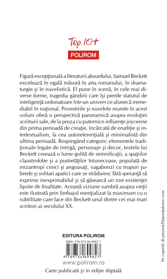 Figură excepţională a literaturii absurdului, Samuel Beckett excelează în egală măsură în arta romanului, în dramaturgie şi în nuvelistică. El pune în scenă, în cele mai diverse forme, tragedia gândirii care îşi pierde statutul de inteligenţă ordonatoare într-un univers ce alunecă iremediabil în iraţional. Povestirile şi nuvelele reunite în acest volum oferă o perspectivă panoramică asupra evoluţiei scriiturii sale, de la proza cu puternice influenţe joyceene din prima perioadă de creaţie, încărcată de erudiţie şi intertextualism, la cea autoreferenţială şi minimalistă din ultima perioadă. Respingând categoric elementele tradiţionale legate de intrigă, personaje şi decor, textele lui Beckett creează o lume golită de semnificaţii, a spaţiilor claustrofobe şi a pustietăţilor întunecoase, populată de mizantropi cinici şi angoasaţi, vagabonzi cu trupuri şubrede şi solitari apatici care se străduiesc fără speranţă să exprime inexprimabilul şi să găsească un rost existenţei lipsite de finalitate. Această viziune sumbră asupra vieţii este ilustrată prin limbajul esenţializat la maximum cu o subtilitate care face din Beckett unul dintre cei mai mari scriitori ai secolului XX.