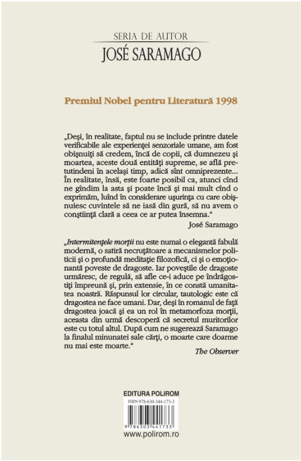 „Intermitențele morții nu este numai o elegantă fabulă modernă, o satiră necruțătoare a mecanismelor politicii și o profundă meditație filozofică, ci și o emoționantă poveste de dragoste. Iar poveștile de dragoste urmăresc, de regulă, să afle ce-i aduce pe îndrăgostiți împreună și, prin extensie, în ce constă umanitatea noastră. Răspunsul lor circular, tautologic este că dragostea ne face umani. Dar, deși în romanul de față dragostea joacă și ea un rol în metamorfoza morții, aceasta din urmă descoperă că secretul muritorilor este cu totul altul. După cum ne sugerează Saramago la finalul minunatei sale cărți, o moarte care doarme nu mai este moarte.” (The Observer)