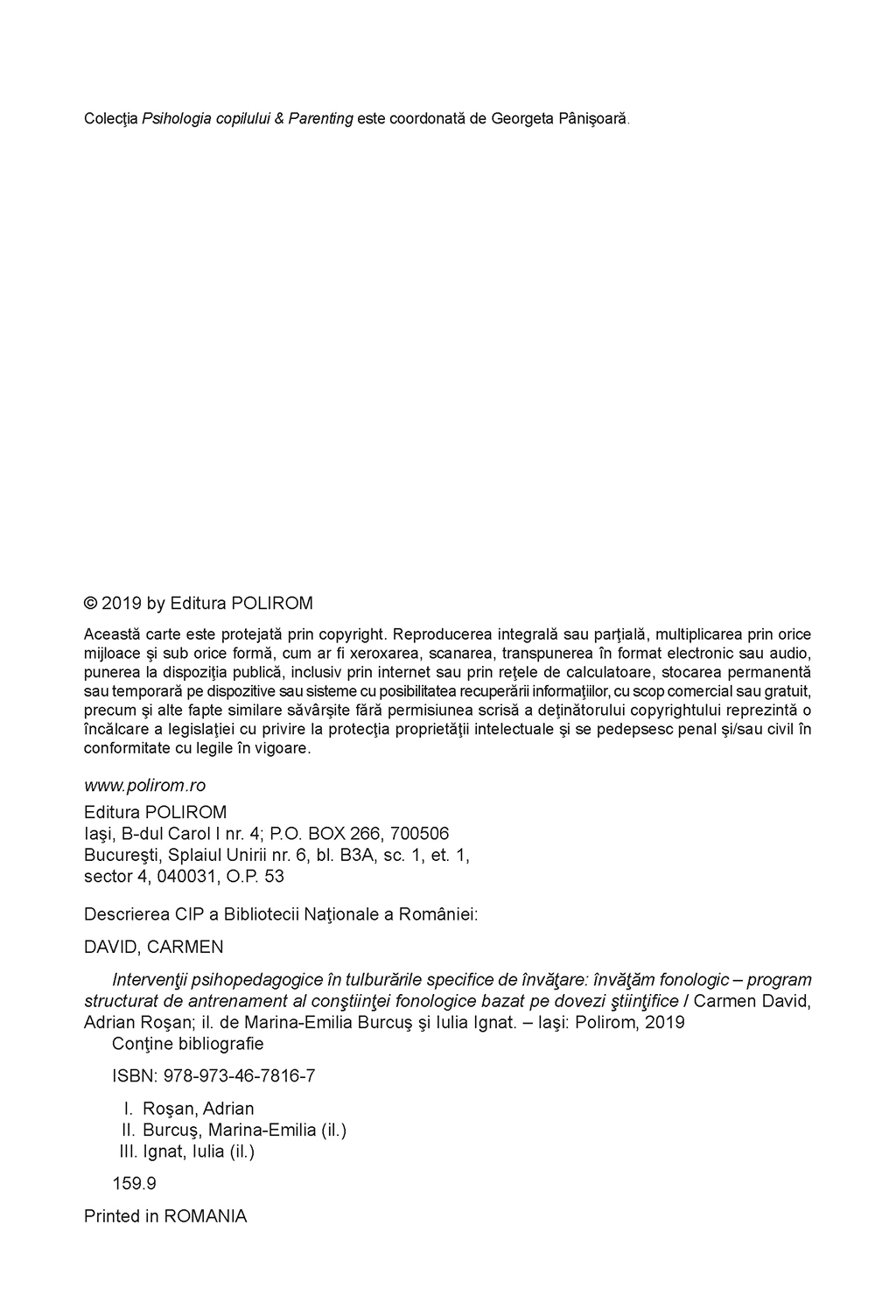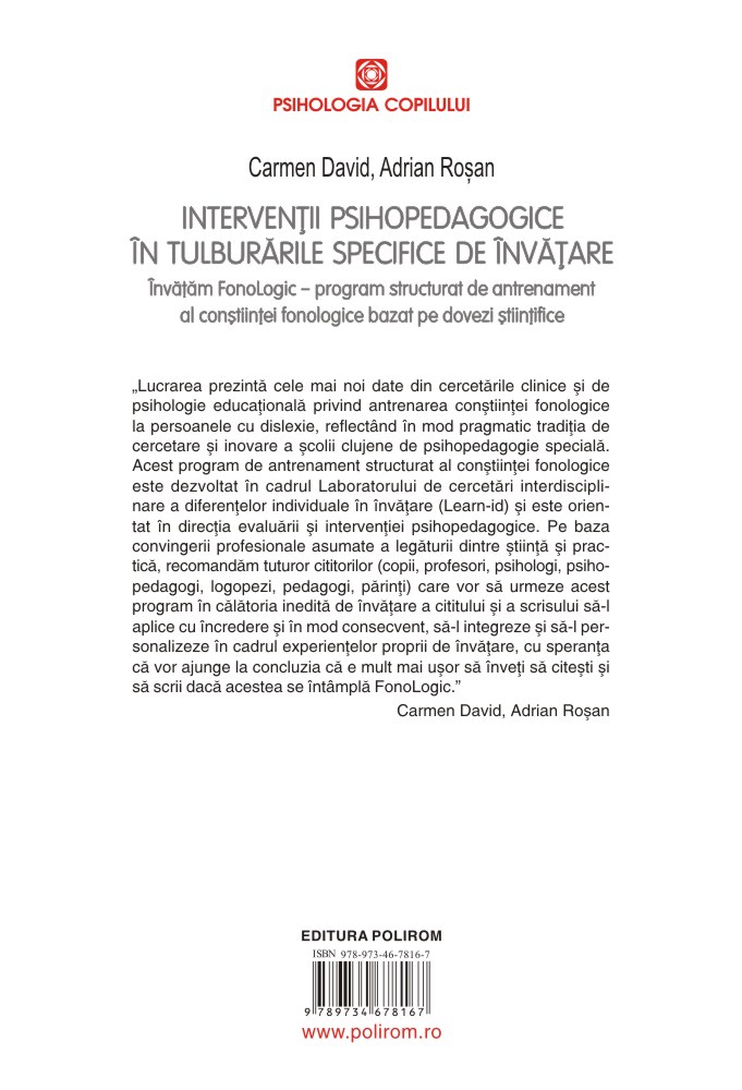 „Lucrarea prezintă cele mai noi date din cercetările clinice şi de psihologie educaţională privind antrenarea conştiinţei fonologice la persoanele cu dislexie, reflectînd în mod pragmatic tradiţia de cercetare şi inovare a şcolii clujene de psihopedagogie specială. Acest program de antrenament structurat al conştiinţei fonologice este dezvoltat în cadrul Laboratorului de cercetări interdisciplinare a diferenţelor individuale în învăţare (Learn-id) şi este orientat în direcţia evaluării şi intervenţiei psihopedagogice. Pe baza convingerii profesionale asumate a legăturii dintre ştiinţă şi practică, recomandăm tuturor cititorilor (copii, profesori, psihologi, psihopedagogi, logopezi, pedagogi, părinţi) care vor să urmeze acest program în călătoria inedită de învăţare a cititului şi a scrisului să-l aplice cu încredere şi în mod consecvent, să-l integreze şi să-l personalizeze în cadrul experienţelor proprii de învăţare, cu speranţa că vor ajunge la concluzia că e mult mai uşor să înveţi să citeşti şi să scrii dacă acestea se întîmplă FonoLogic.” (Carmen David, Adrian Roşan)
