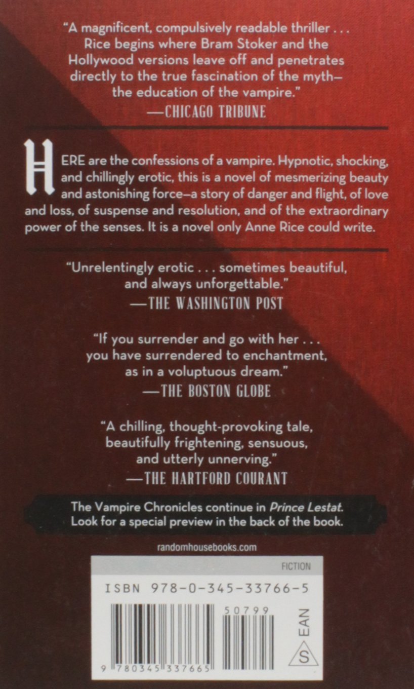 Here are the confessions of a vampire. Hypnotic, shocking, and chillingly erotic, this is a novel of mesmerizing beauty and astonishing force—a story of danger and flight, of love and loss, of suspense and resolution, and of the extraordinary power of the senses. It is a novel only Anne Rice could write.