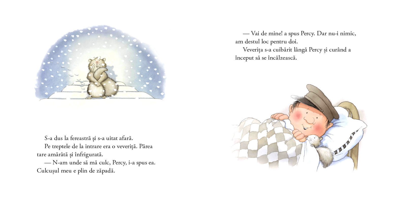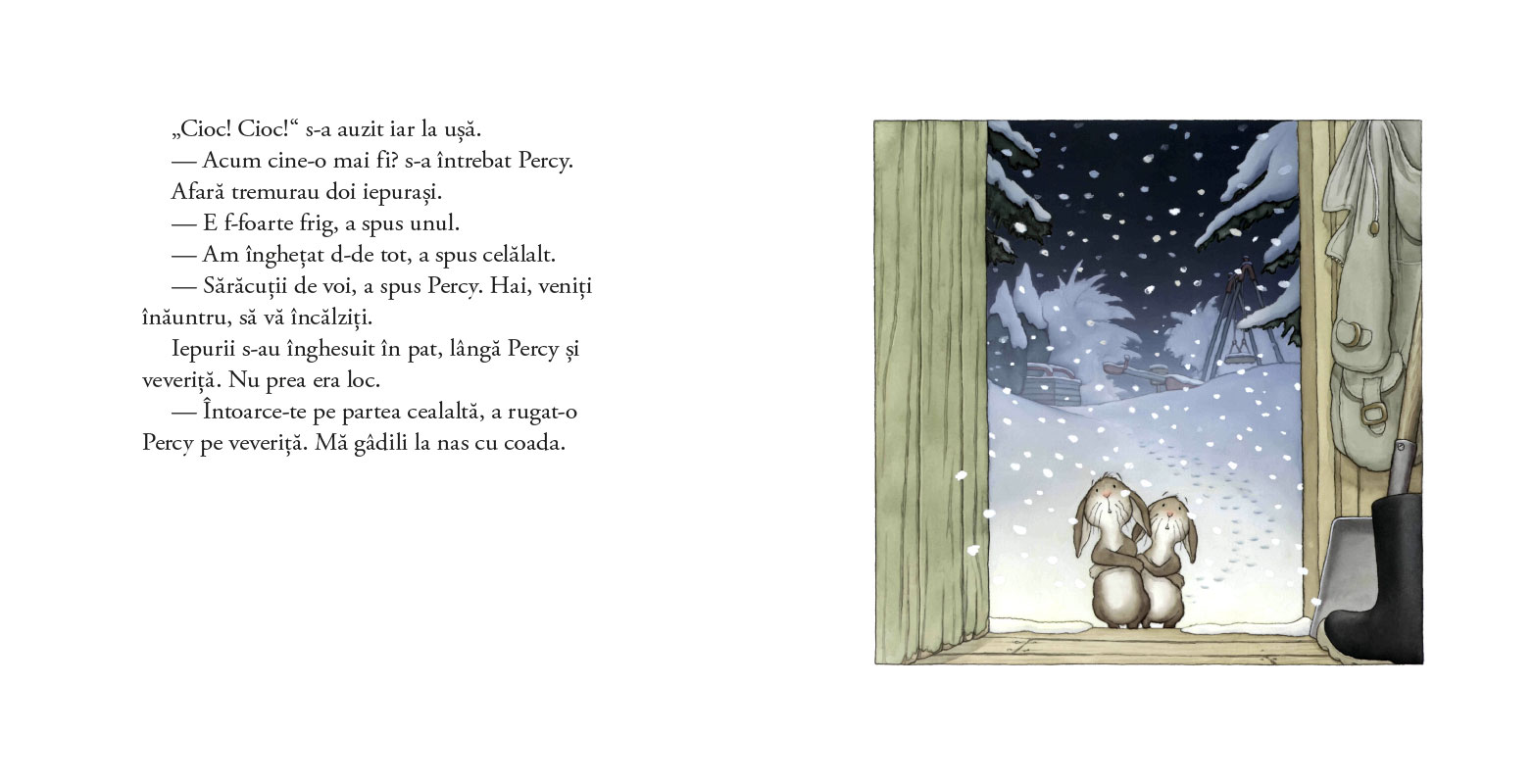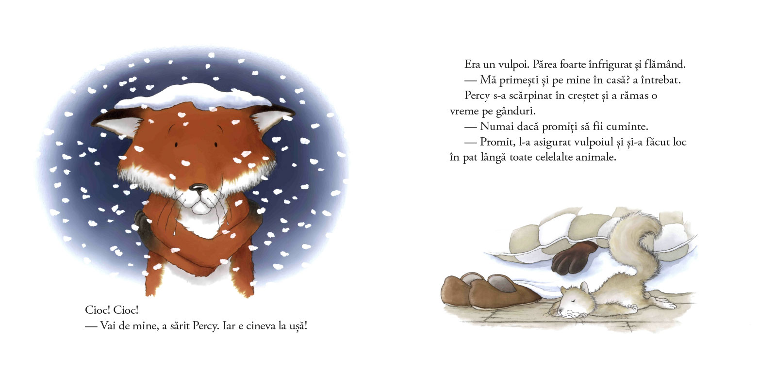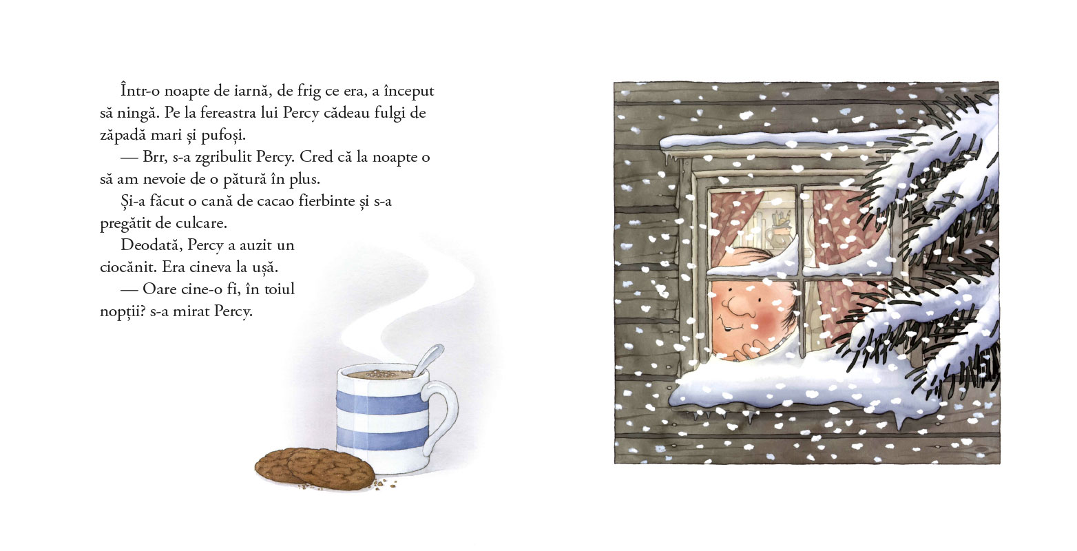 „Într- noapte cu ninsoare“ este prima carte din seria „Percy Pădurarul și prietenii săi“, iar ediția de față este una de sărbătoare, în format mare, generos, cu copertă cartonată lucioasă și interior pe hârtie cretată, plus un poster 60x60 cm care-i invită pe copii la un mic joc: pot să găsească în ilustrații câteva obiecte de-ale bunului pădurar Percy?